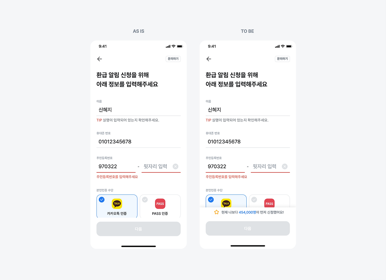 이렇게 개선하여 A/B테스트한 결과, 간편인증을 완료하는 고객이 기존에 비해 14% p 상승했어요.