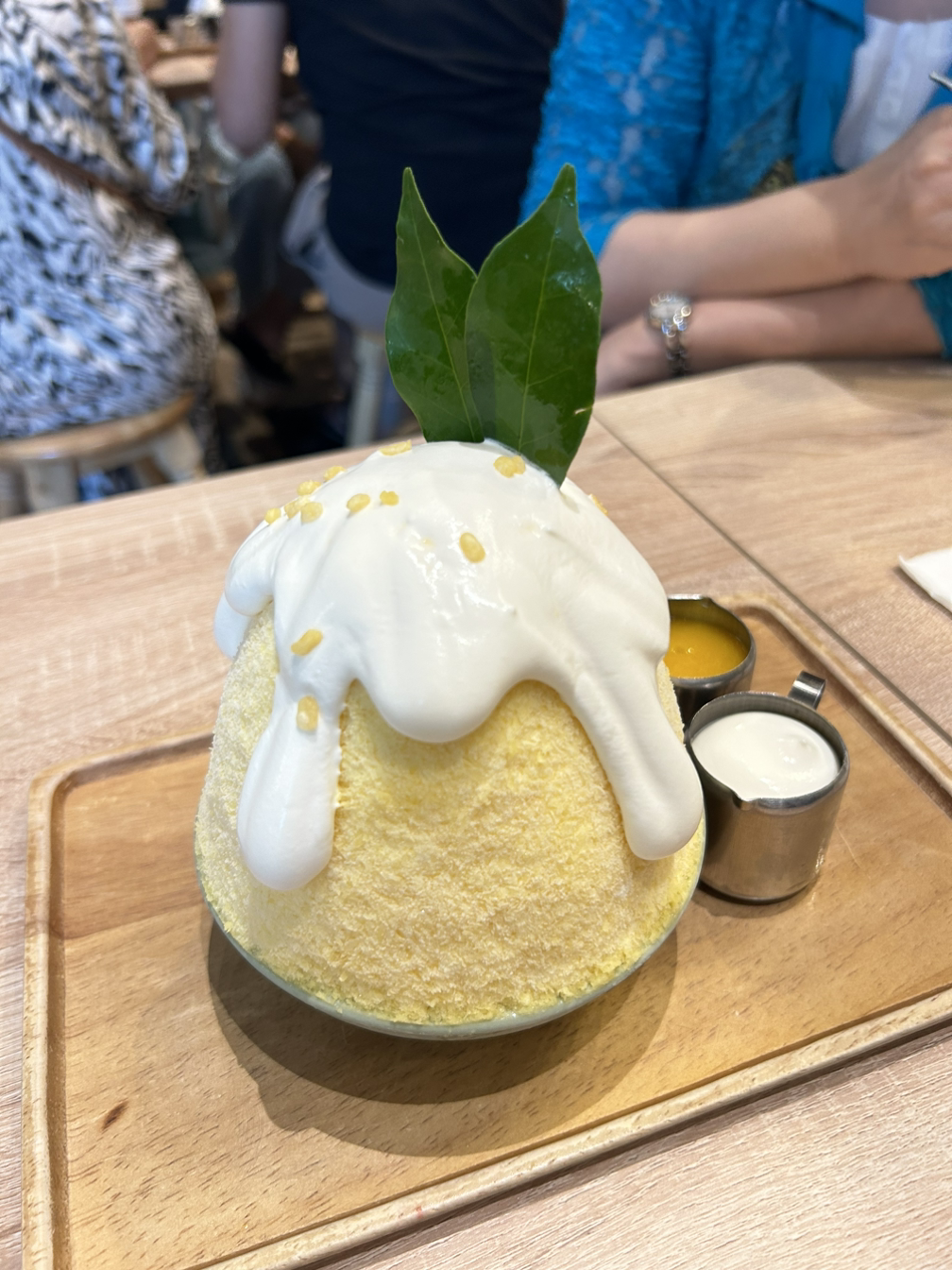 드디어 우리 차례! 대표메뉴 망고 스티키 라이스빙수를 먹었는데 맨 밑에 찰쌀밥이 의외였는데 조화로워 오래 기다린 보람 있게 맛도 있었다