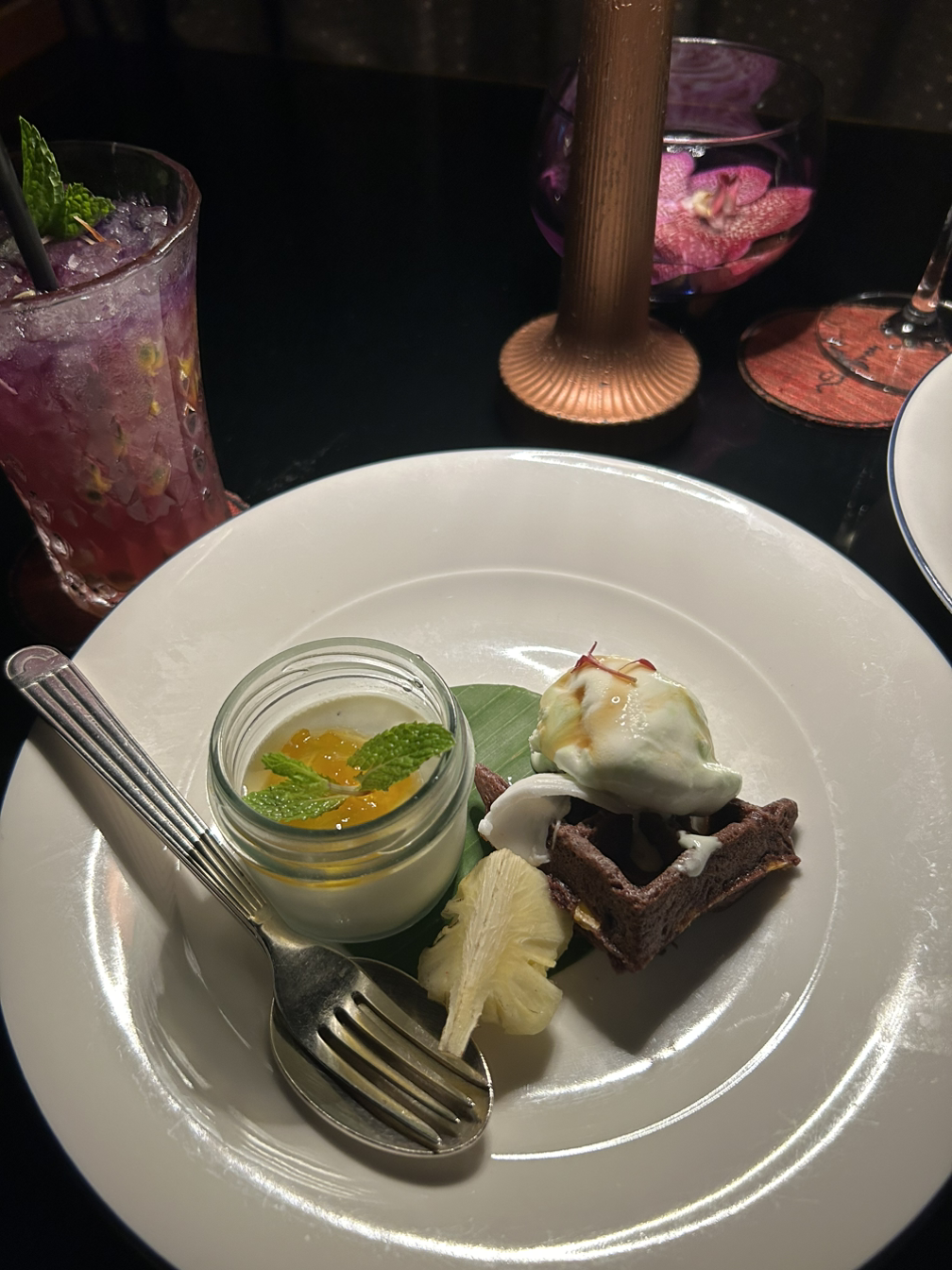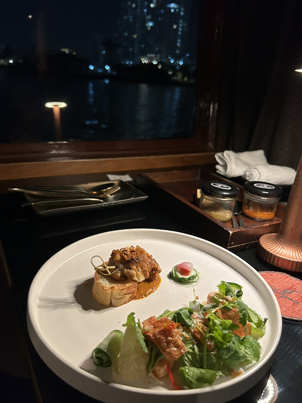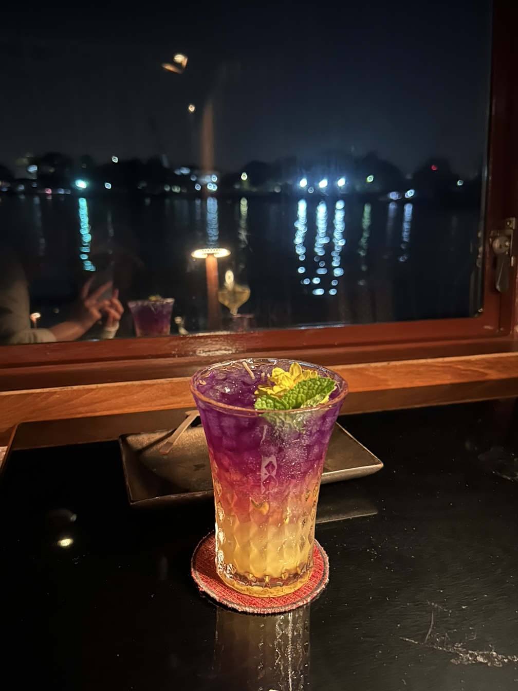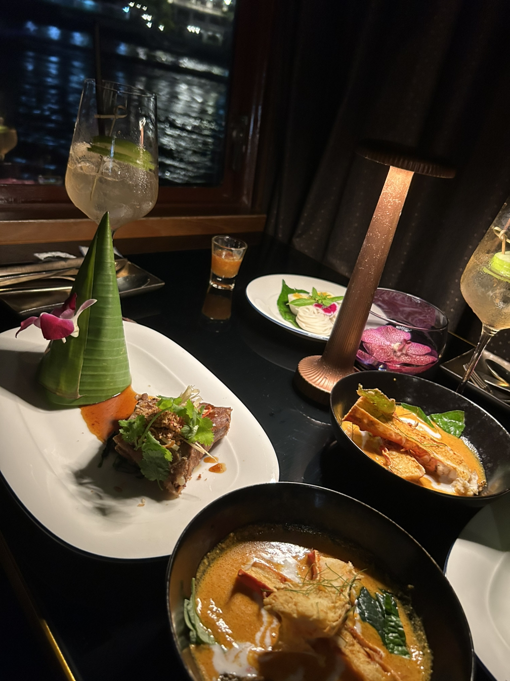 태국 코스 요리도 다 맛있었고 분위기 있게 꾸민 목테일 (무알콜 칵테일)과 불빛에 비치는 물결이 사랑스럽게 예뻤다