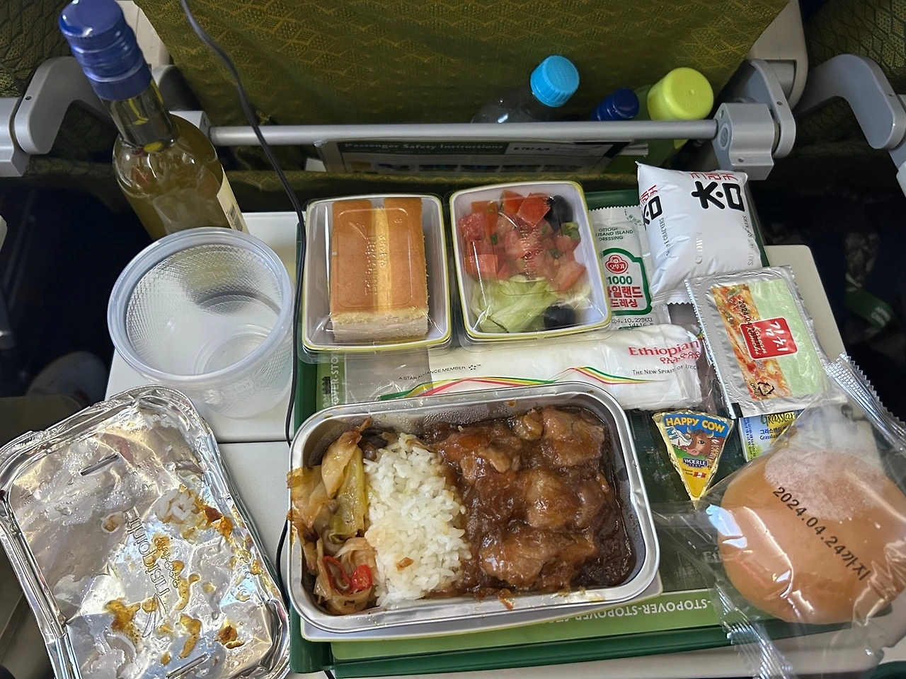 짧은 시간이지만 식사가 제공되었고 치킨과 밥과 김치등이 나왔다 외국인들도 김치를 잘 먹는 걸 보고 흐뭇하였다 그리고 검정캔(하베사 에티오피아 국민 맥주)을 시켰는데 술을 잘 못 먹는 내입에도 맛이 너무 좋았다 깜깜한 밤하늘에서 내려다본 나리타공항 근처에 별빛처럼 반짝이는 불빛이 보여 갑자기 가슴이 두근두근 해졌다