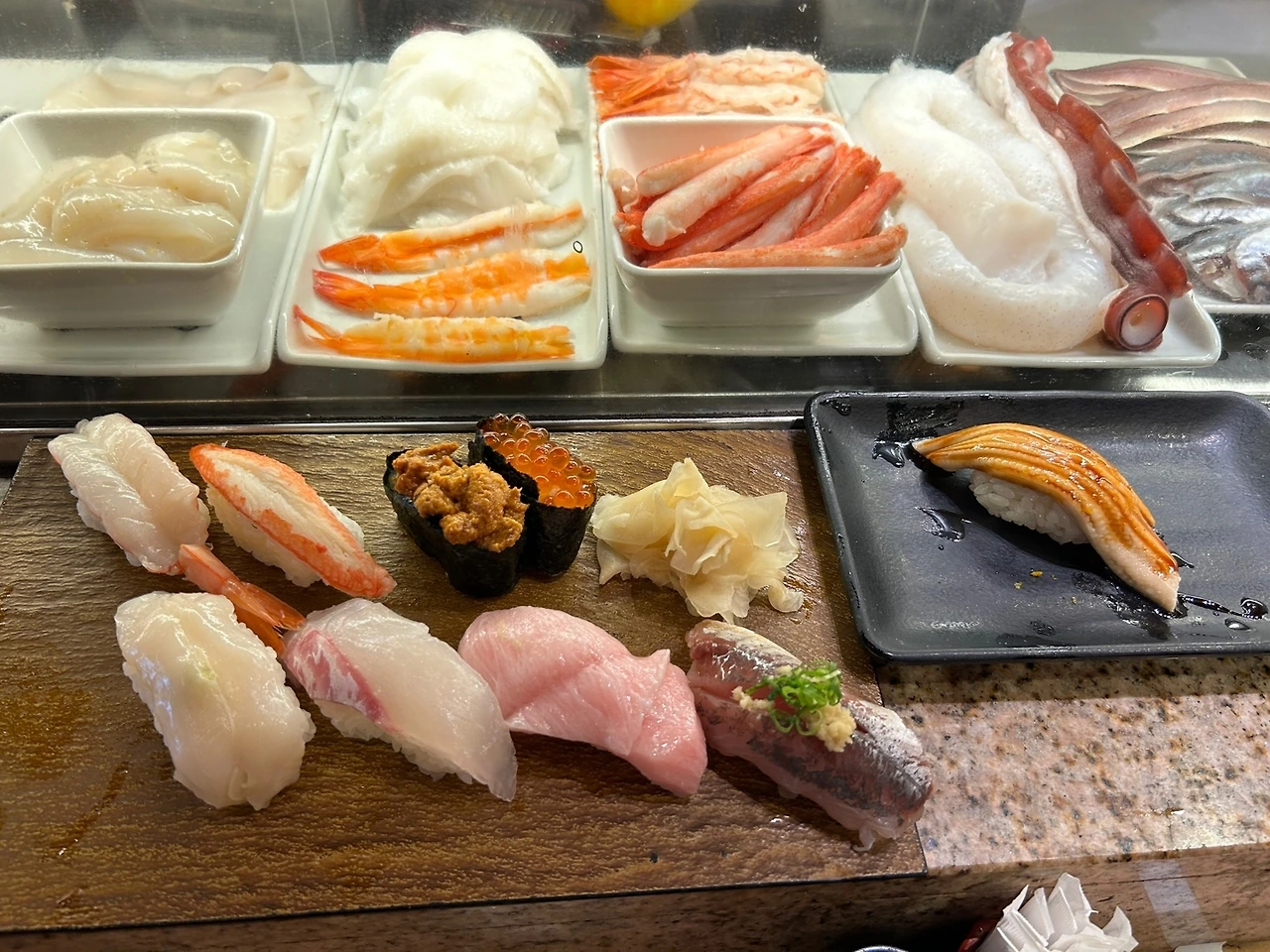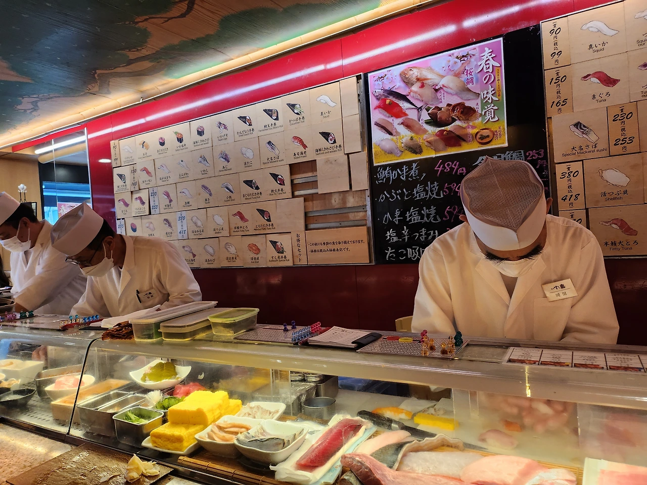 야상잠바 속에 조끼를 입고 숙소 1층으로 내려가서 트론트 옆에 무료라테를 마시며 거리를 걸어갔다 도착한 츠키지수산시장에는 많은 여행객들이 인산인해를 이루고 있었다 아침식사로 초밥을 먹기로 했는데 너무 복잡해서 거기에서 10분 정도 걸어서 스시조에 가서 서서 초밥을 먹었다 딸이 엄마가 서서 초밥을 먹는 게 불편할까 봐 걱정을 했지만 생각보다 좋았고 이색적인 경험을 하는 게 여행이 주는 묘미가 아닐까 생각한다 난 초밥을 별로 안 좋아해서 런치메뉴 990엔과 딸은 많이 좋아해서 1990 초밥을 시켜서 먹었다 맛있고 사람들이 줄 서서 먹는 곳이 역시 달랐고 가격도 좋았다 츠키지역에서 갈아타고 신주쿠 산초메역에서 내려서 이세탄백화점에 갔다 딸이 우리나라보다일본에서 가격이 싼 꼼데가르송티 2개를 주저하다 일본에 자주 못 갈거라 그냥 샀다