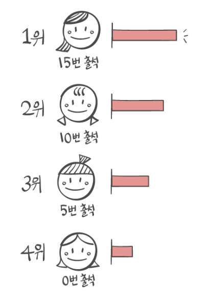 한 학기가 끝나고 같은 수업을 들은 학생들에게 4명의 여성 참가자들의 사진을 보여주며 매력도를 평가하게 했습니다. 그런데 그 교양 수업의 수강생은 200명이나 되었습니다. 그래서 서로 친분이 있지 않으면 수업 듣는 학생을 기억하기란 쉽지 않았습니다. 과연 여성들의 매력도 결과는 어떻게 나왔을까요?