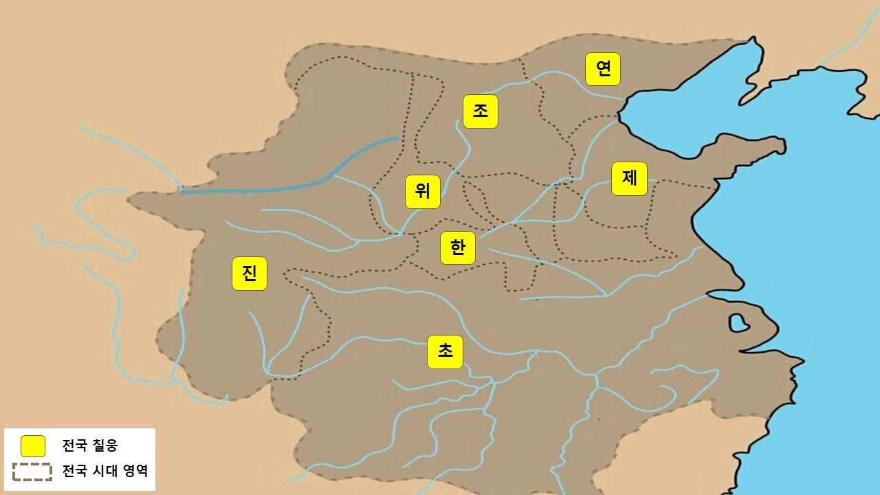 전국시대에는 서쪽의 진秦, 중원의 한韓, 위魏, 조趙 동쪽에 제齊, 북쪽의 연燕, 남쪽의 초楚 이렇게 일곱 나라가 전국칠웅이라 불리며 활약합니다. 그리고 전국시대에는 일곱 개의 나라가 천하통일을 위해 치열하게 다툽니다.