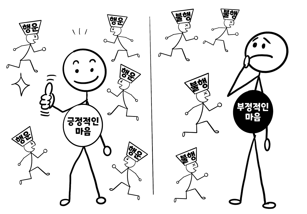 마음이 긍정적이면 좋은 말과 좋은 행동을 하고, 마음이 부정적이면 나쁜 말과 나쁜 행동을 합니다. 그리고 긍정적인 마음가짐은 긍정적인 사람을 만들고, 주변에 긍정적인 사람이 모이게 됩니다. 주변에 긍정적인 사람이 많으면 나에게 행운이 찾아올 확률이 높아집니다. 반대로 마음이 부정적이면 부정적인 사람이 되고, 결국 주변에 사람이 모이지 않거나 부정적인 사람들만 모이게 될 것입니다. 나와 주변이 부정적이면 행운은 영원히 찾아오지 않을 것입니다.