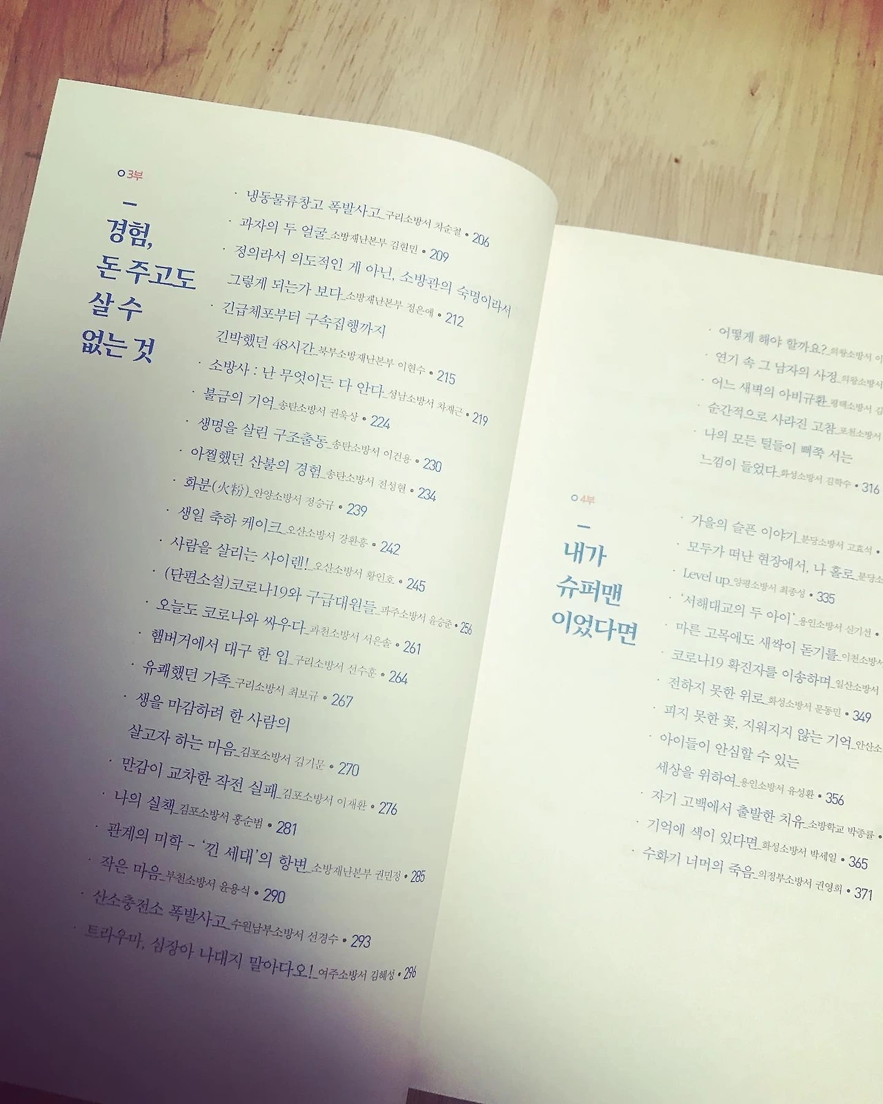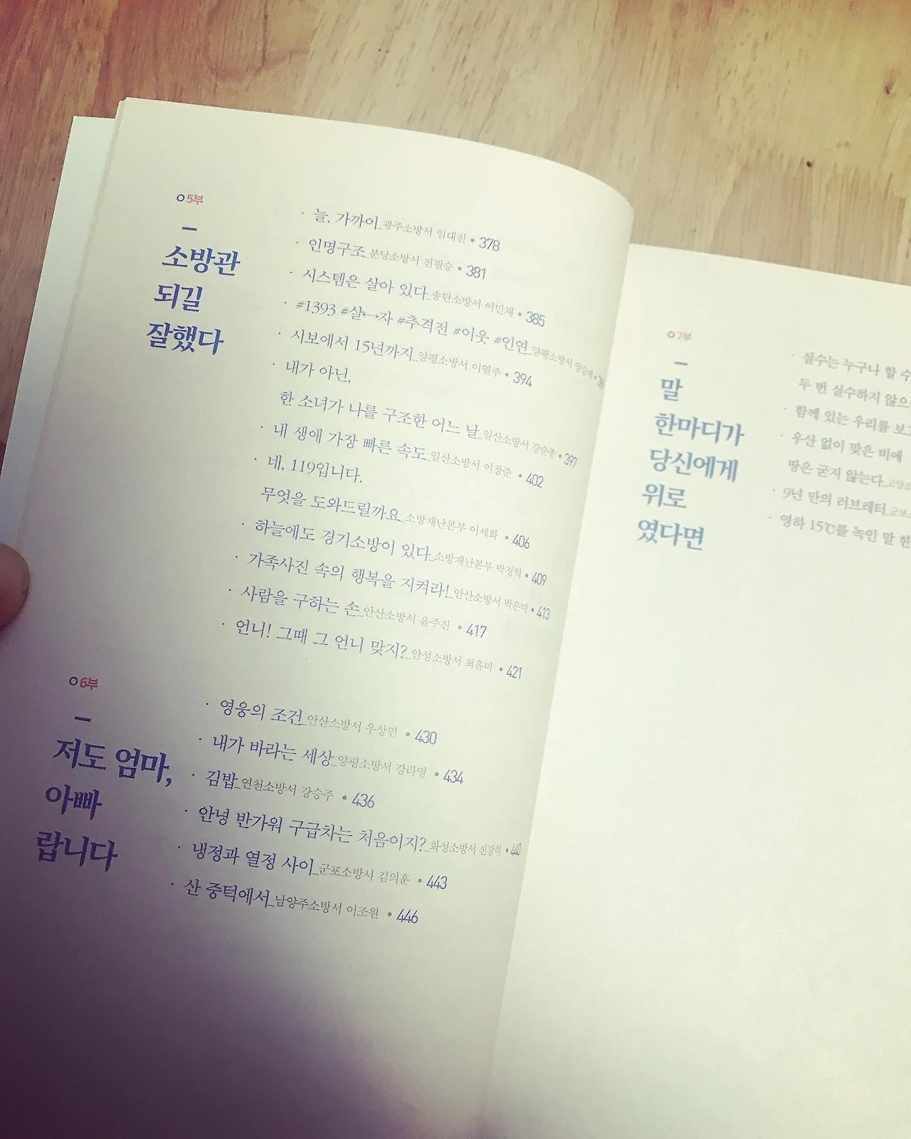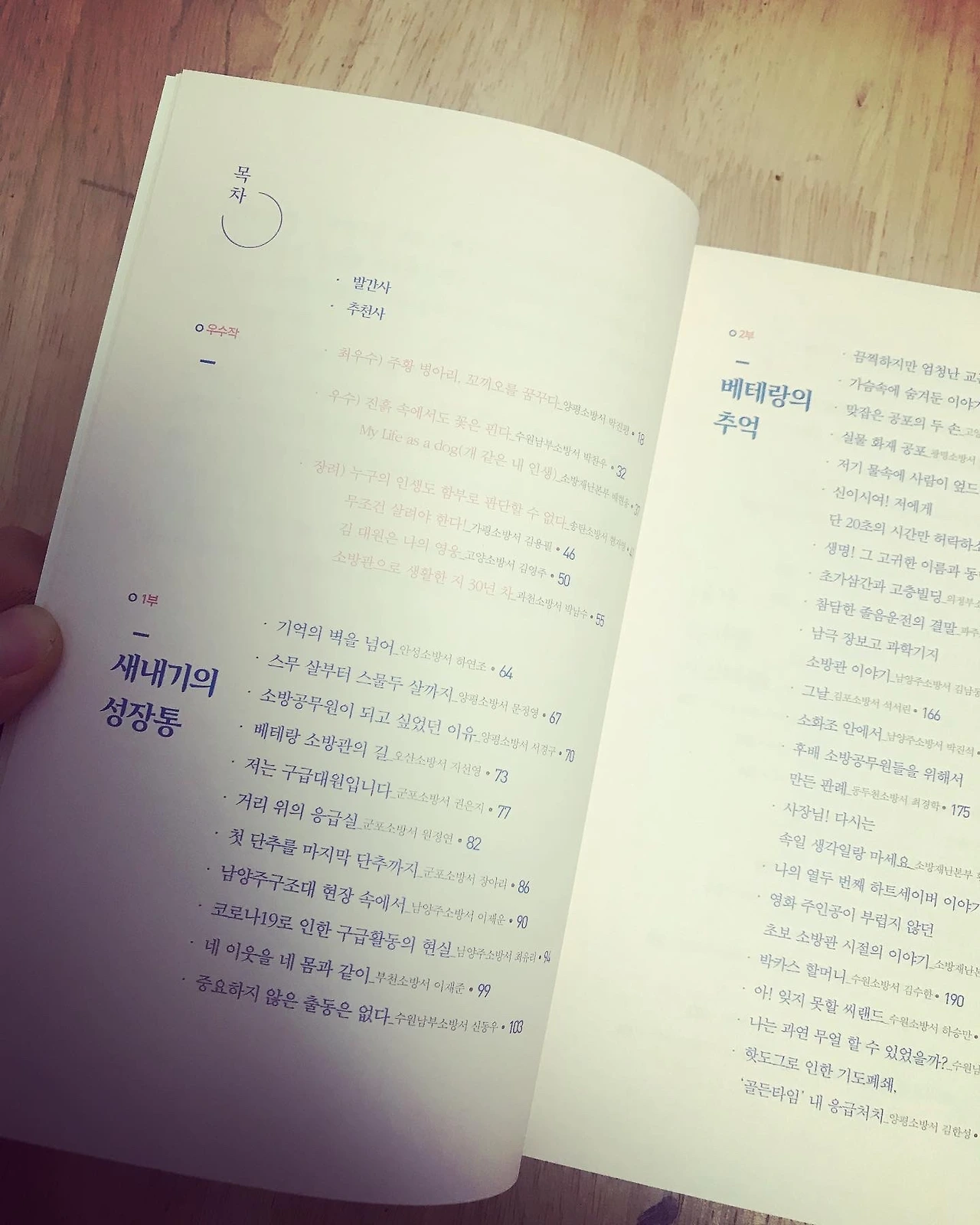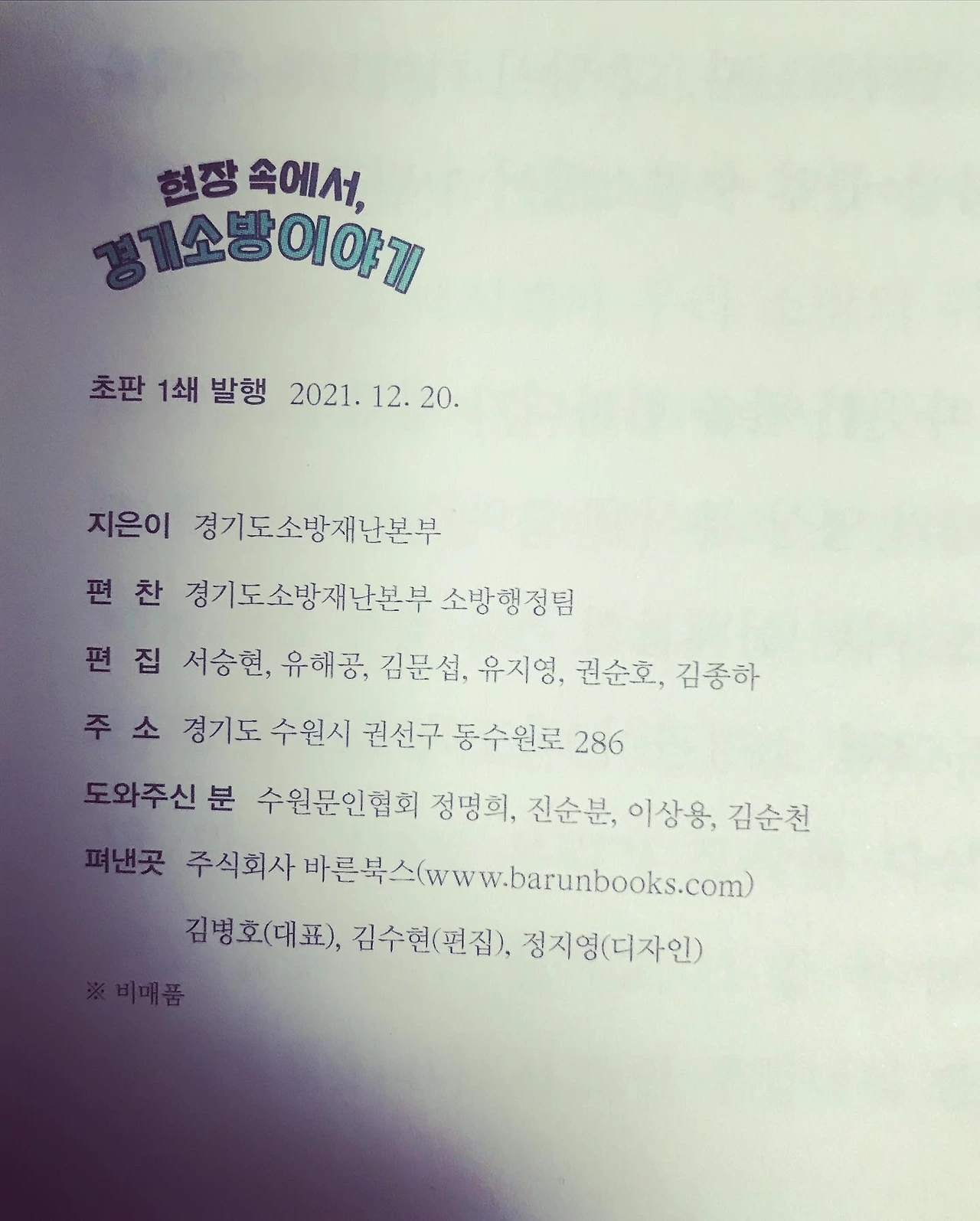 2021년 12월 말에 따끈한 ‘경기 소방 이야기’가 도착했다. 심의회가 끝나고, 나는 편집 위원으로 참석했다. 시간이 부족했지만 열심히 글들을 분석했다. 나름대로 목차를 만들어봤는데, 감사하게도 거의 수정 없이 목차가 인쇄되었다. 완전~ 뿌듯하다. 표지가 예쁘다. 공무원 수기지만 공무원스럽지 않은 표지다. 출판사를 잘 만난 덕분이다.
