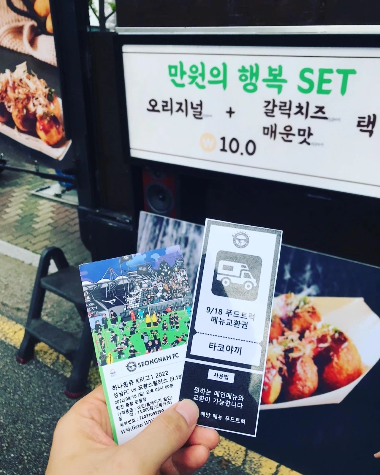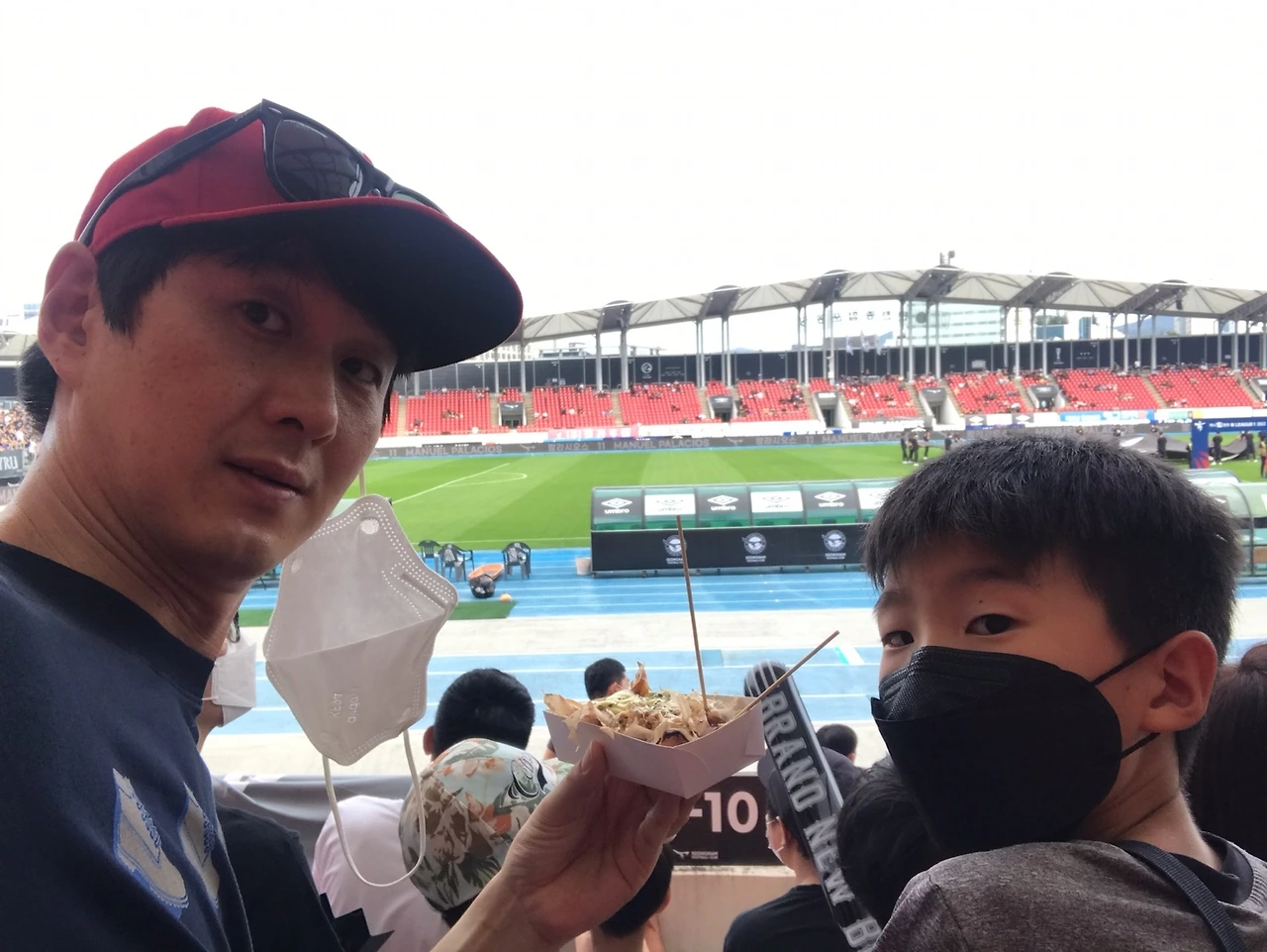 오늘은 성남과 포항의 경기를 보러 성남 탄천종합운동장에 갔다. 오후 3시 경기였는데, 1시간 전에 도착했다. 우리가 응원하는 팀은 아니지만 성남 홈 석에 앉았다. 맞다. 솔이가 입장 전에 얼떨결에 퀴즈를 맞혀서 '다코야키' 상품권을 받았다. 문제가 정확히 무엇인지는 기억이 안 나나, 진행자가 내게 기회를 줘서, 솔이가 말해준 '21'이라고 말했더니 정답이란다. 맛있는 다코야키를 먹었다.