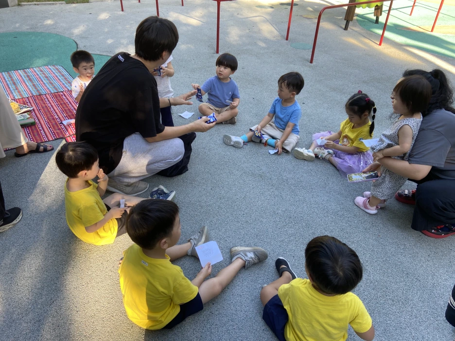 흥분된 얼굴을 한 아이들은 총총걸음으로 보물을 찾으러 나선다. '과연 만 3살 된 친구들이 보물을 금방 찾을 수 있을까? 너무 쉽게 찾으면 어떻게 하지?' 보물을 찾는 아이들을 보니, 재밌다. 바로 눈앞에 있는데도, 그냥 지나친다. 엄마나 할머니의 도움으로 보물을 찾는다. '아직 어려운가?' 모든 아이가 보물을 다 찾아갈 즘, 한 친구가 아직 보물을 찾지 못하고 있다. 얼굴에는 짜증이 가득한 채로. 나는 아이 근처 풀숲에 보물을 한 장 떨어트리고, 돌을 살짝 덮어 놓았다. 다행히 아빠의 도움을 받아 전원 보물을 다 찾았다.