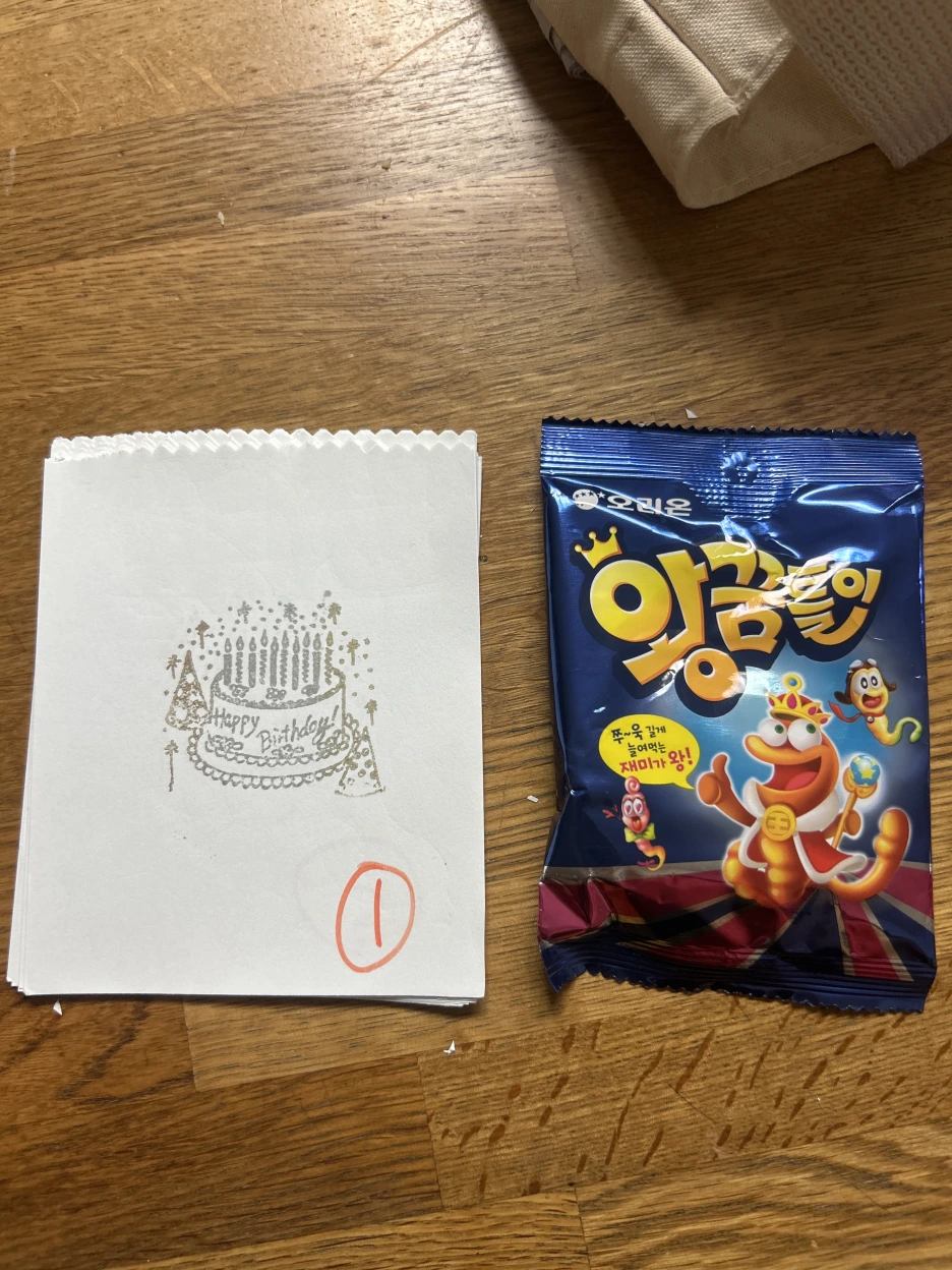 그냥 아무 생각 없이 카톡 방에 던졌는데, 두 엄마들의 반응이 좋다. 오늘 할 생각은 아니었는데, 왠지 오늘 해야 할 것 같다. '괜히 말했나. 은근히 귀찮네.' 도서관에서 오는 길에 마트에서 보물찾기 선물인 왕꿈틀이를 20개 정도 샀다. 집에서 종이를 20장 잘라서, 큰 보물 케이크 도장을 찍고, 번호를 매겼다.