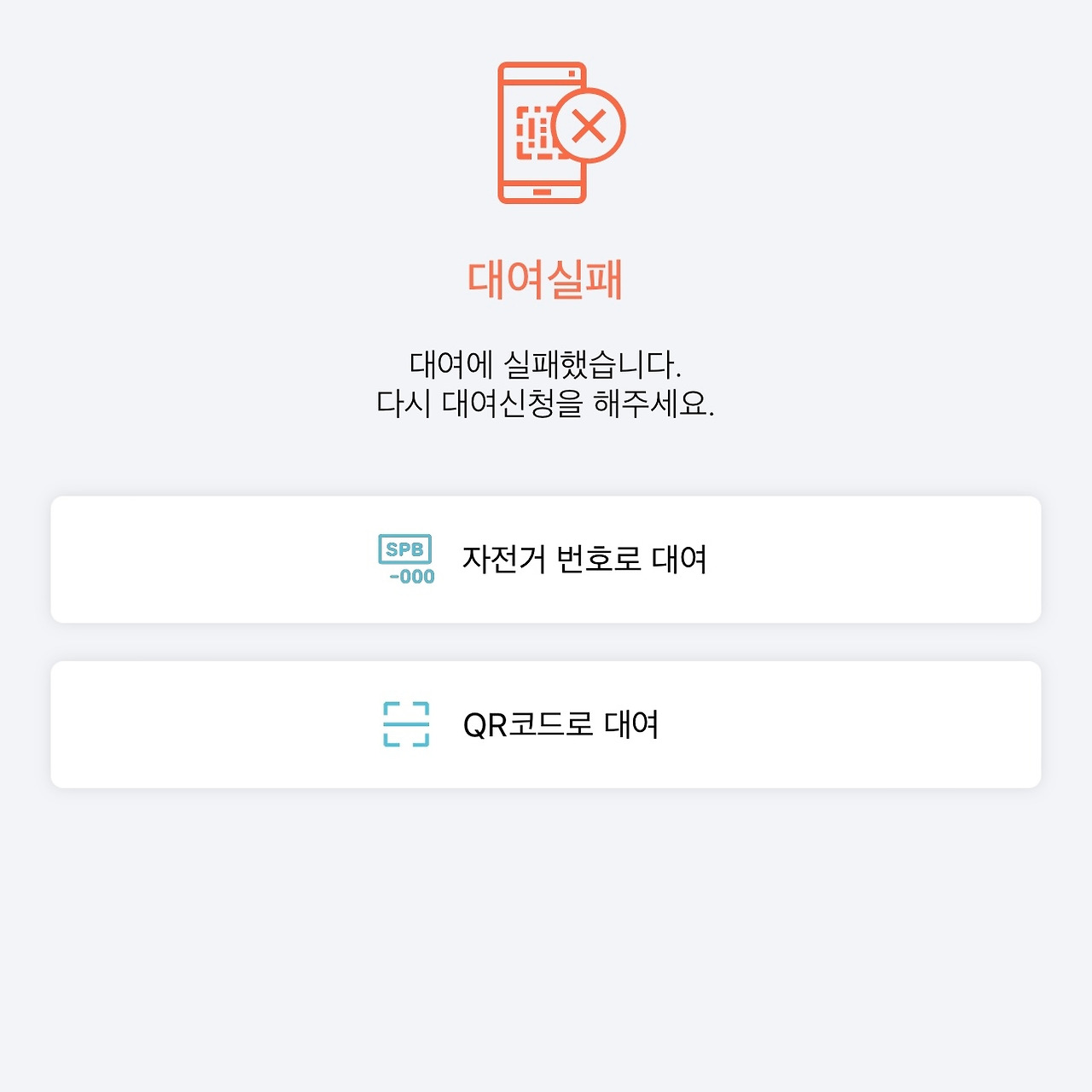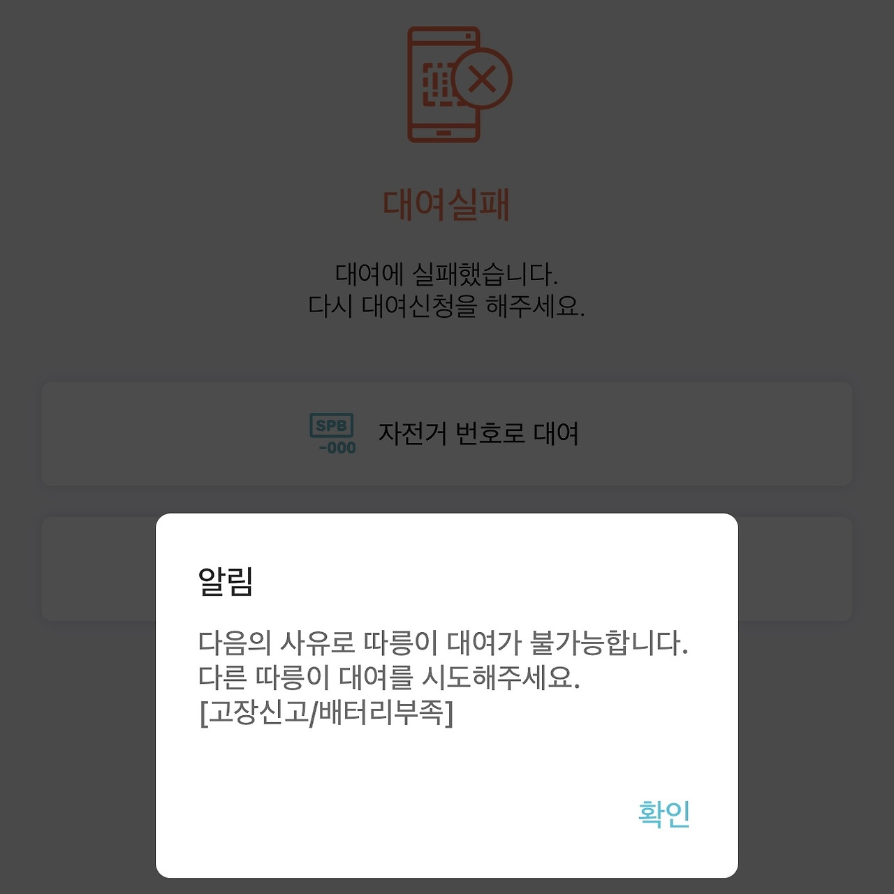 몇 번을 시도해도 대여가 되지 않았다. 고장 신고가 들어간 따릉이였다.