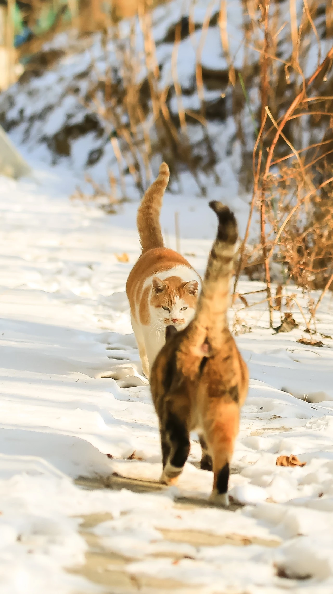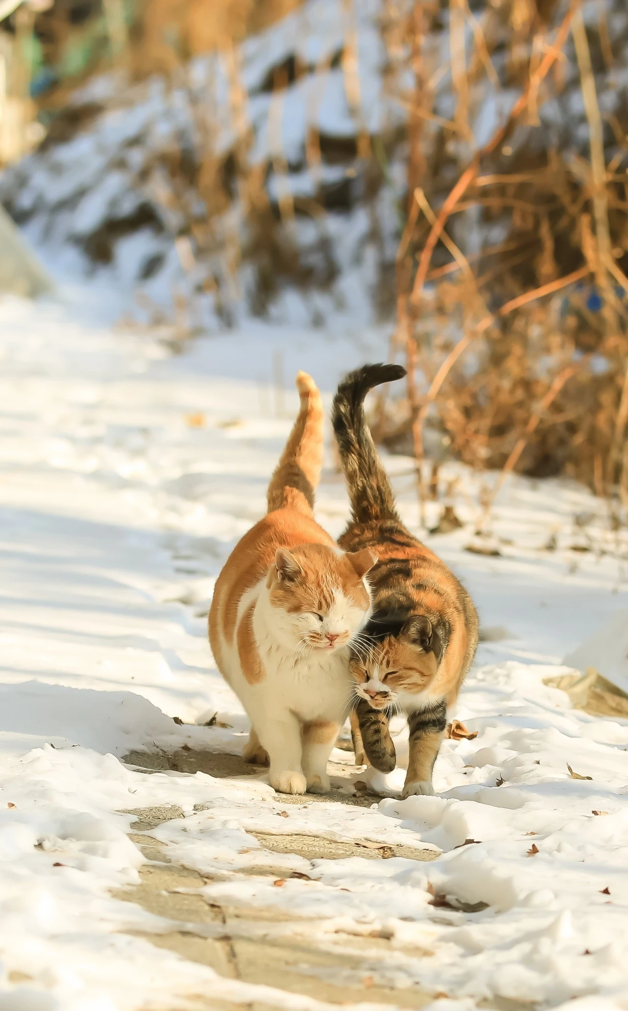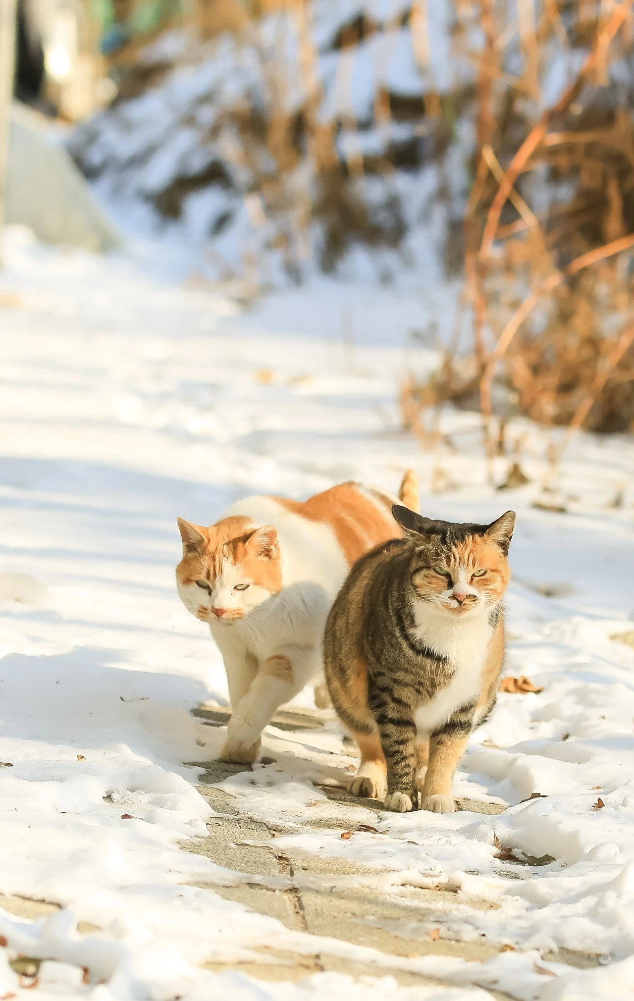 떠오르는 눈 위에 고양이들이 만나서