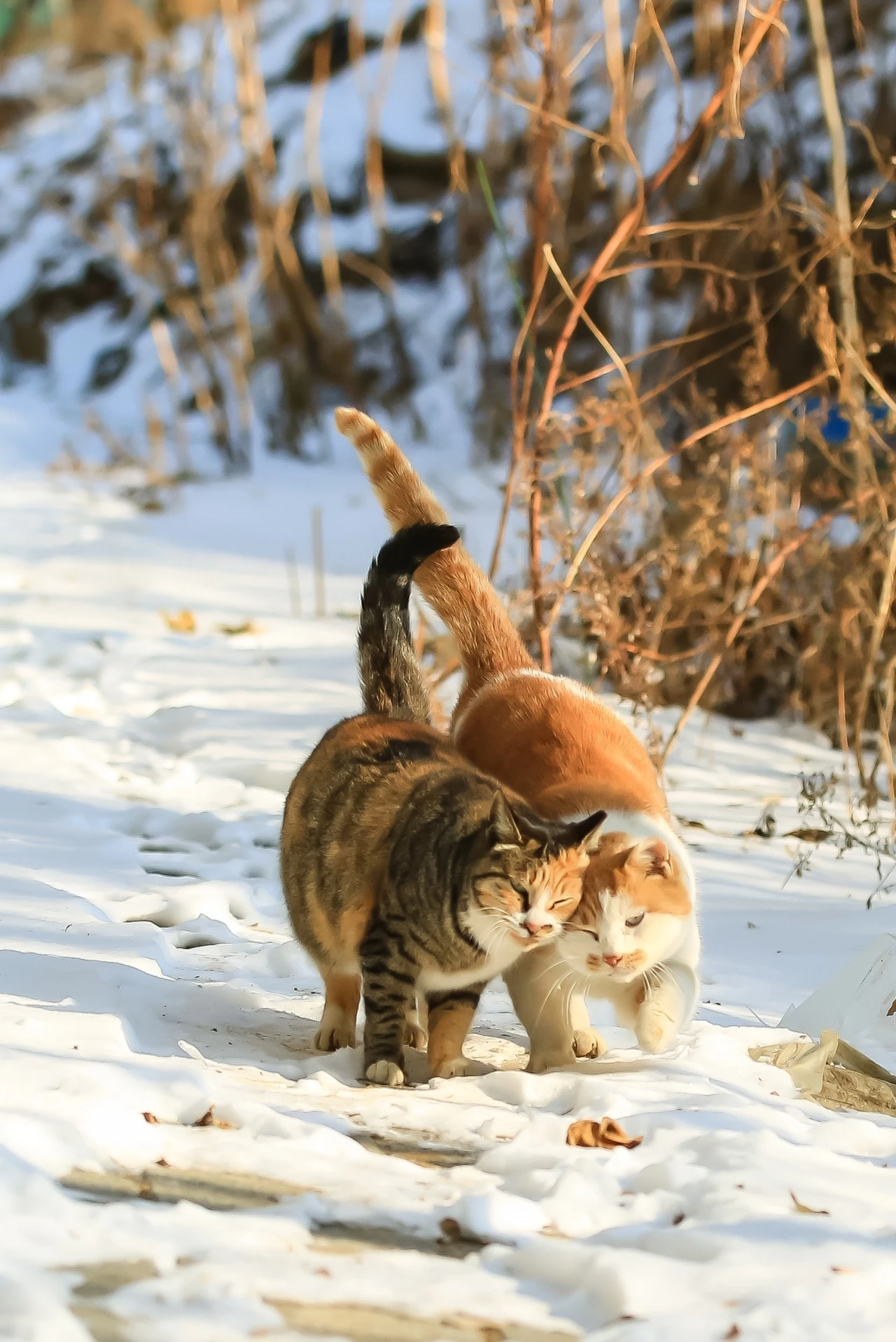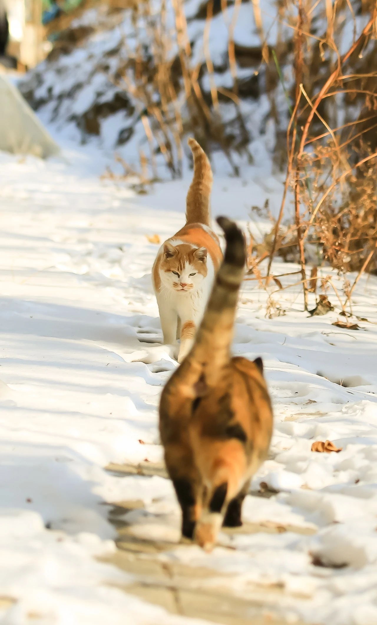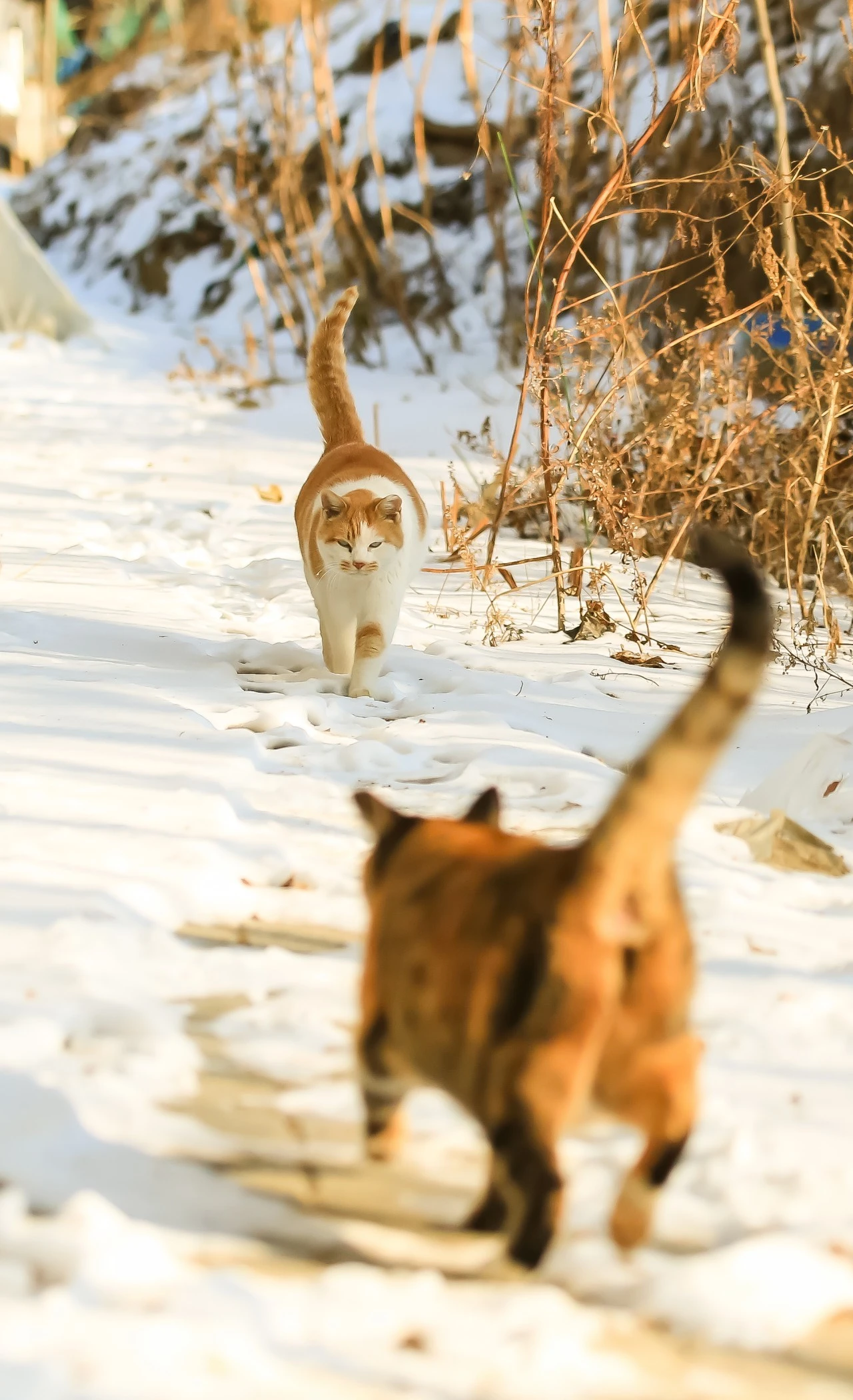 떠오르는 눈 위에 고양이들이 만나서