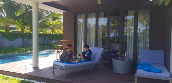 우리가 감동받은 부분은 또 있었으니, 바로 풀빌라! 우리 룸에 딸린 대형 풀빌라다. 사방으로 텐스가 쳐 있어서 프라이빗하게 밤늦게까지도 아무 때나 놀 수 있다. 눈뜨자마자 수영, 자다가도 수영이 가능한 풀빌라다.