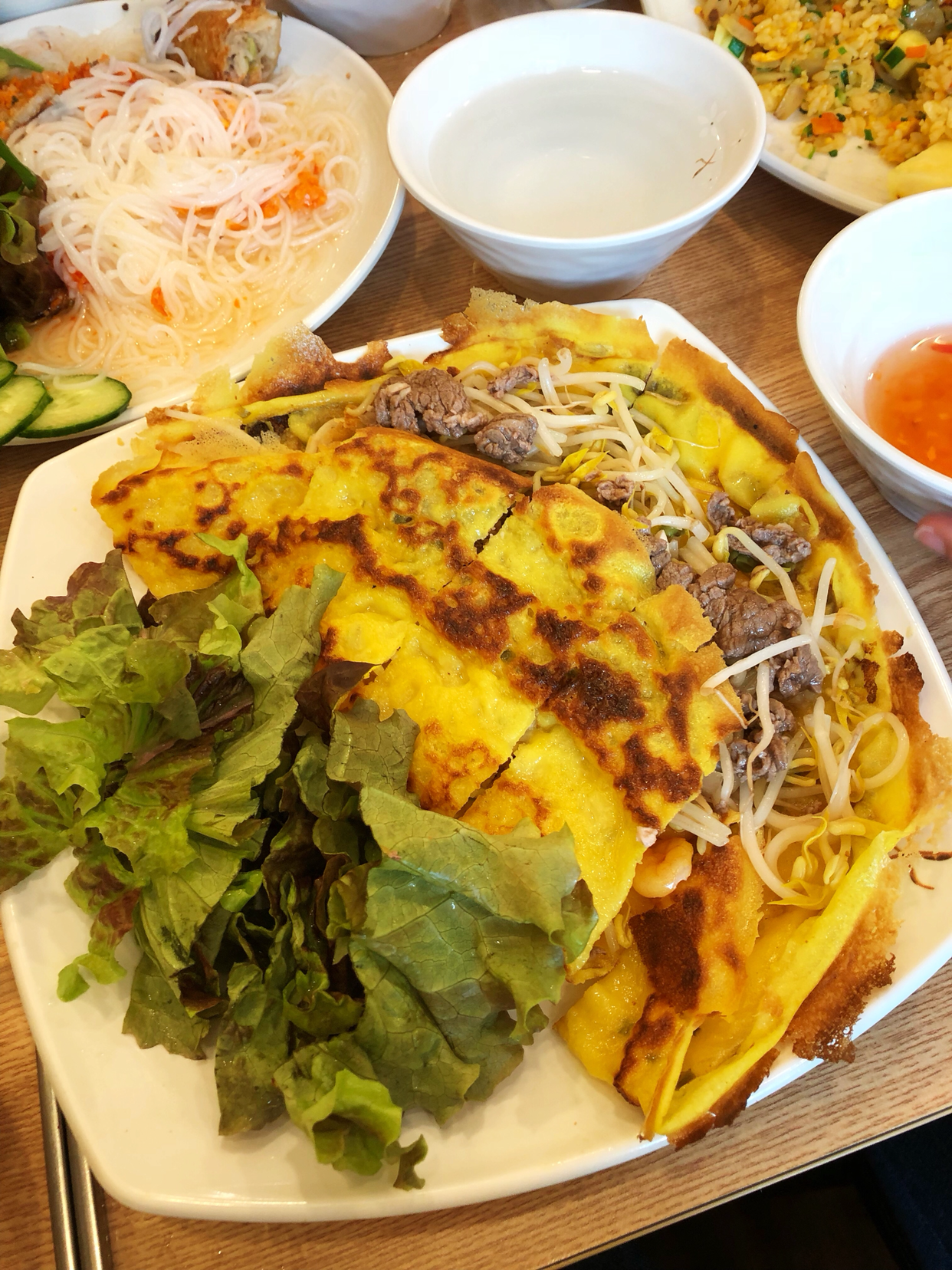 베트남 음식에는 쌀국수 말고도 생소한 음식들이 꽤 많은데, 그 중 분짜와 짜냄 정도는 우리한테도 꽤 익숙해졌다. 메밀전병 느낌의 반권은 안에 간 돼지고기를 넣어 베트남 음식 치곤 꽤 담백하다. 그래도 식감이 익숙한 느낌은 아니어서 반권보다는 아예 튀김종류인 짜냄이 더 입맛에 맞았다. 독특하고 생소했던 음식 중에는 반쎄오가 최고봉인 것 같다. 반쎄오는 아래 사진 속에 부침개같이 생긴 음식을 라이스페이퍼에 다시 싸서 먹는 독특한 음식이다. 이건 베트남이 아니라 이 집에서 처음 먹어본 음식이라서 원래 이런 맛인지까지는 모르겠으나... 신기한 맛이었다. (그런데 이 집은 구우실 때 마가린을 많이 쓰는 듯.. 마가린 맛이 좀 많이 났다.)