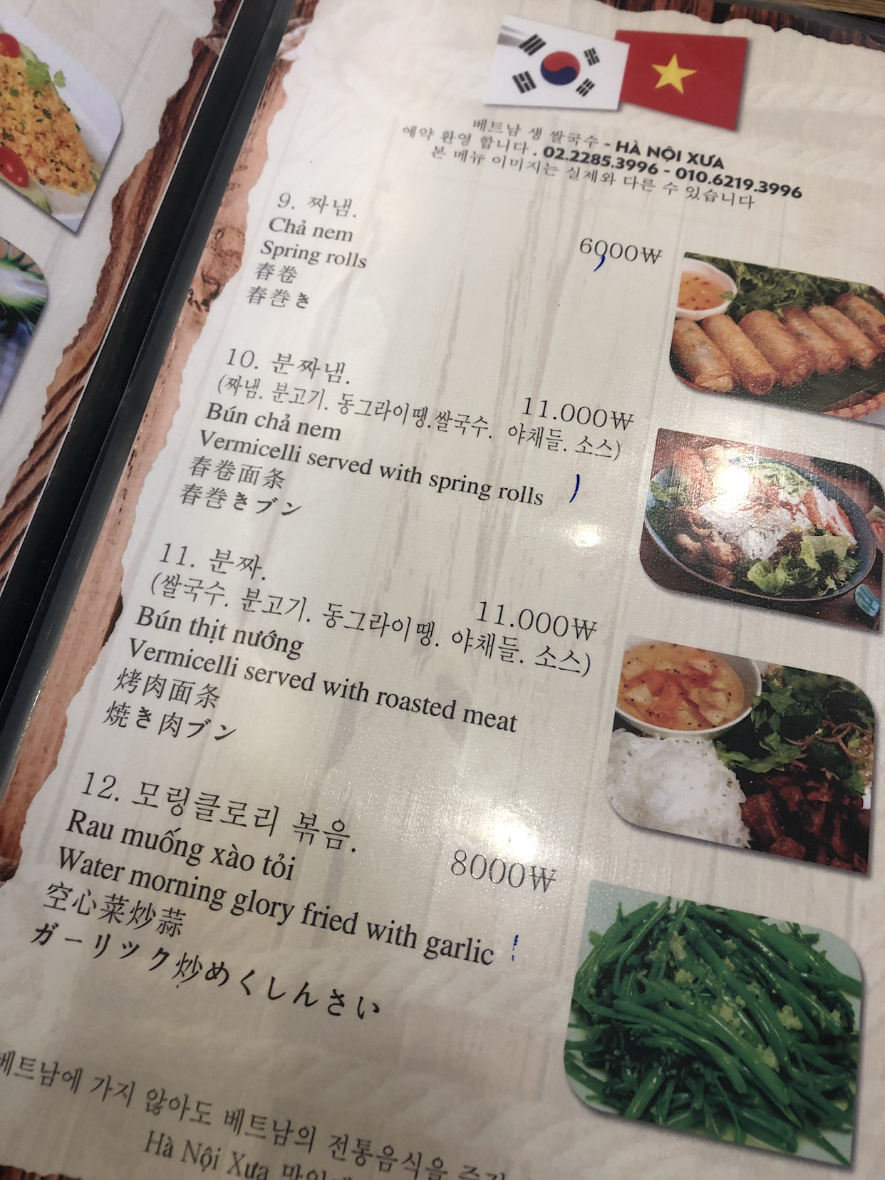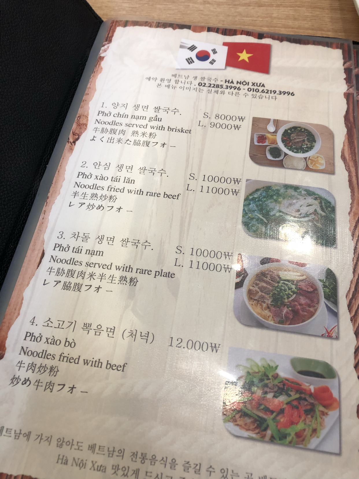이 집, <베트남생쌀국수>는 촌스러운 간판 때문에 사실 첫인상은 별로였다. 일층에서 들어가야 되나 마나를 한참 고민했을 정도였으니까. 그리고 솔직히 저 간판 때문에 나는 그저 그런 동네 프랜차이즈 쌀국수 집 중 하나인줄 알았다. 첫 방문이 늦은 점심시간이었던지라 가게 안도 생각보다 한적했는데, 더더욱 내 기대치를 낮추기에 충분했다. 가게 종업원 분들은 현지 분들처럼 보였고 한국어가 서툴러 보였지만, 그럼에도 아무런 생각이 없었다. 오타가 여기저기 보이는 귀여운 메뉴판도 그냥 ‘명동’에 널린 수많은 관광객 대상 음식점 중 하나인가 보다 하는 생각을 들게 하는 요소 중 하나였다.