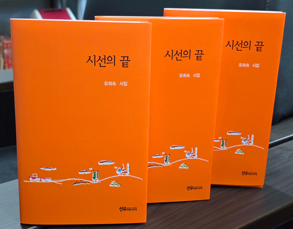 유희숙의 ‘시선의 끝’. ‘시선의 끝’이라는 책 제목에서 시인의 눈길이 어디로 향했는지 궁금해집니다. 책 표지의 짙은 주황색이 주변까지 환하게 합니다. 강렬한 색상을 골랐네요. 첫머리에 실린 시부터 눈길을 끕니다.