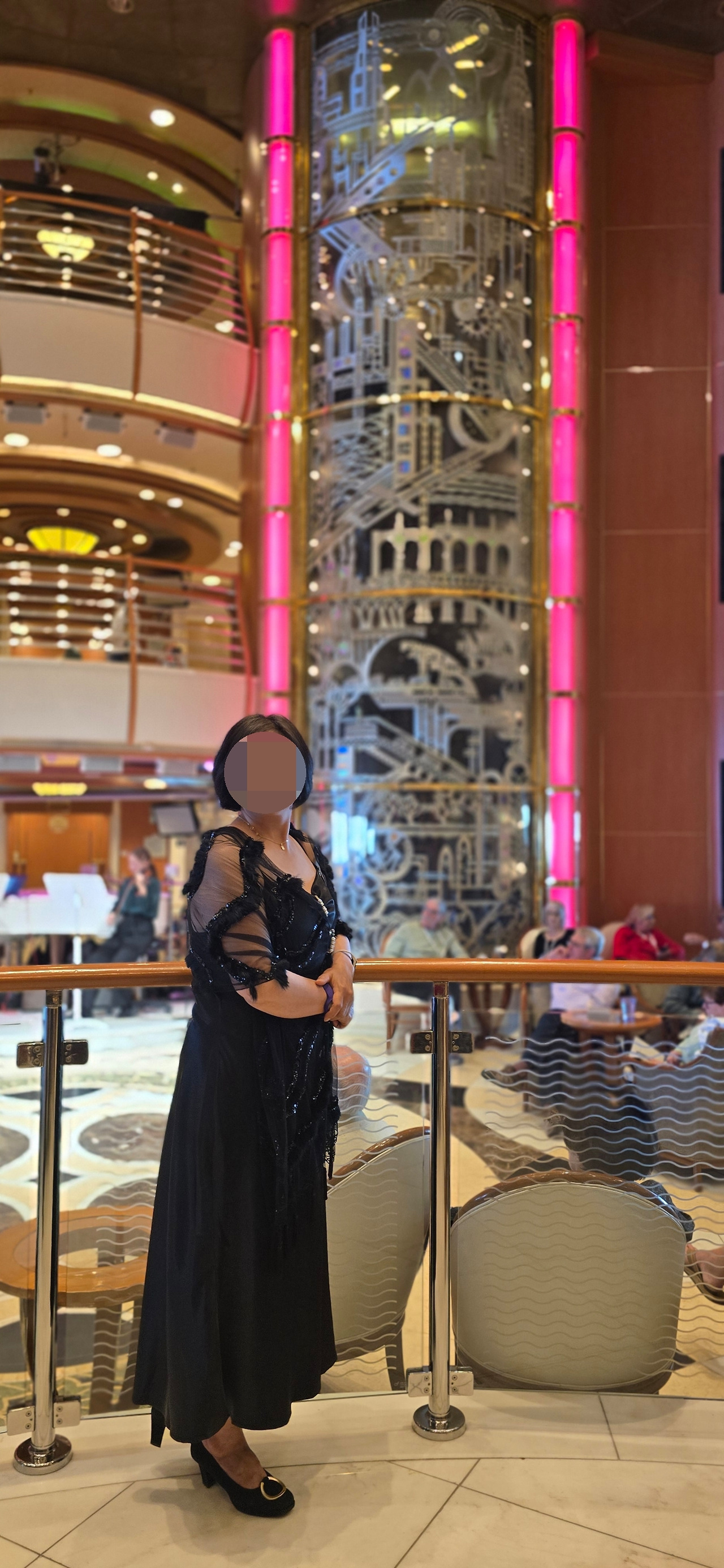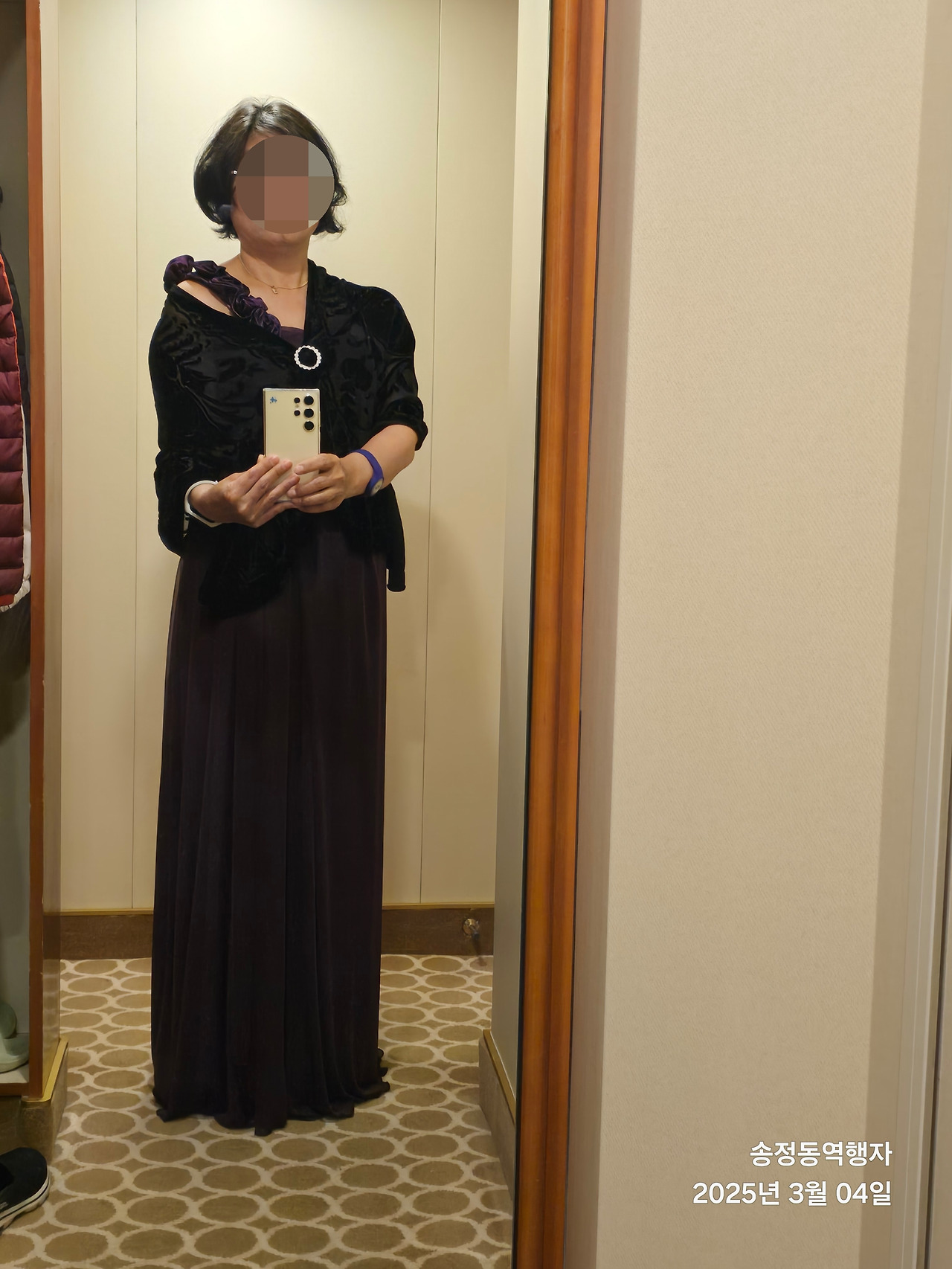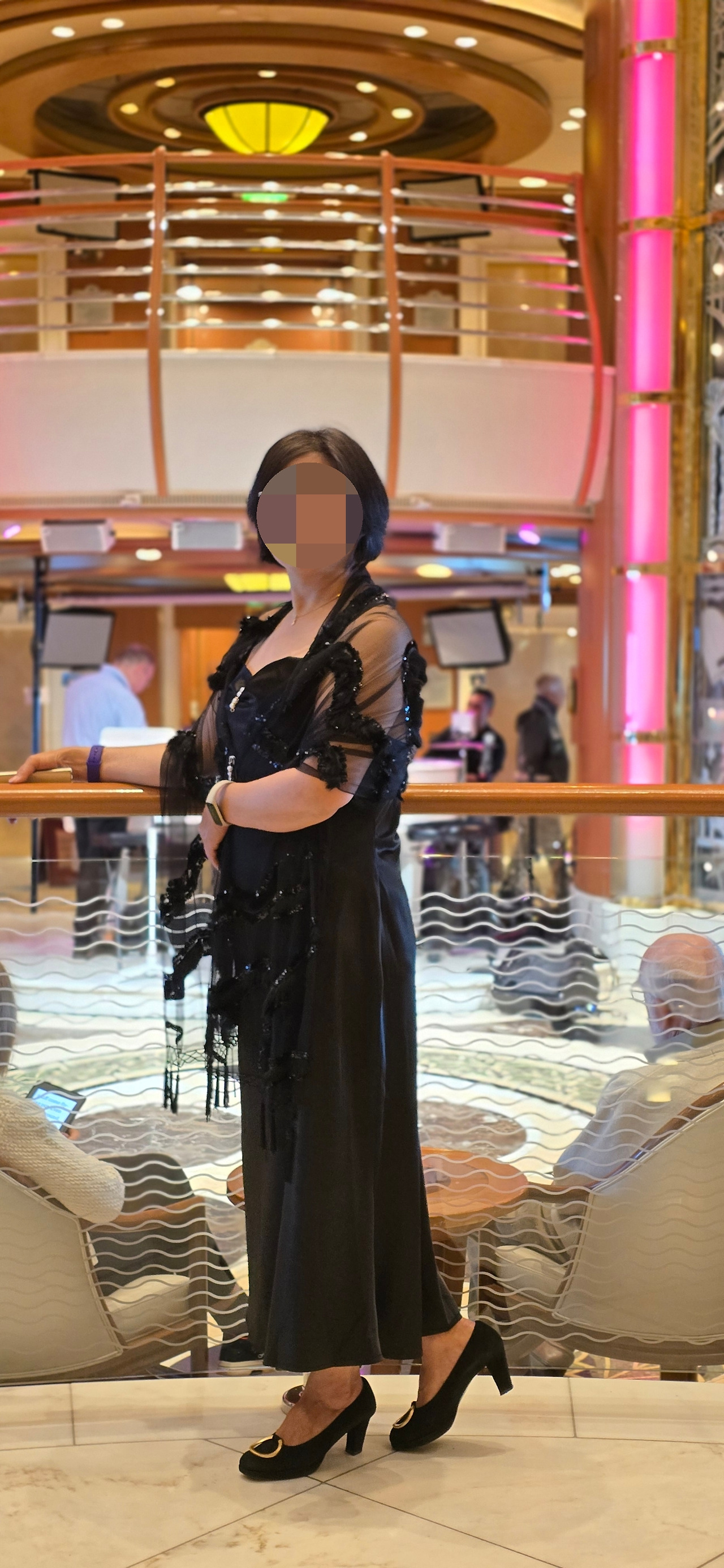 오늘의 드레스 코드다. 어깨를 드러내는 옷이라 숄로 가렸다. 혼자 룸에서 옷을 입어보고 사진을 찍어봤다. 이런 드레스는 사람을 더욱 돋보이게 하기도 한다.