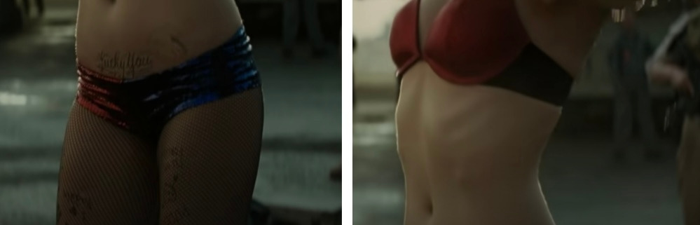 첫째, 할리 퀸은 위에 나타난 것과는 다른, 일반 여성들이 입는 푸시업 브래지어를 착용해야 했습니다. 브래지어의 색깔은 분홍색이나 빨간색처럼 톡톡 튀고 할리 퀸의 성격을 반영하는 색깔이어야 했죠. 둘째, 그런 브래지어가 비치는, 하얗거나 얇은 셔츠를 입어야 했습니다. 셋째, 셔츠를 벗고 브래지어를 노출하는 장면이 적어도 한 장면은 요구되었죠. 넷째, 할리 퀸의 옷이 물에 젖는 장면 역시 요구되었습니다. 아무래도 속옷을 더 선명하게 보여주려는 의도였겠죠. 다섯째, 브래지어를 풀고 벗거나, 착용하는 장면이 있어야 했습니다. 이 다섯 가지 중 최소 네 가지 요건을 충족시켜야 했죠.