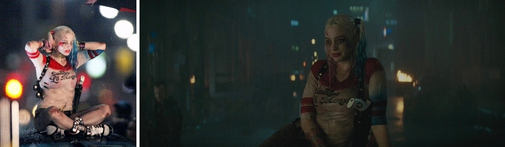 언급했다시피 캐릭터들의 디자인이 이미 완성되고 초반부 촬영이 진행된 상황이었지만, 할리 퀸이 본 코스튬을 입는 장면은 많이 촬영되지 않았기에, 변경이 아예 불가능한 상황은 아니었습니다. 결국 다섯 가지 조건 중 첫 네 가지가 반영되었지요. 할리 퀸은 빨간색 푸시업 브래지어를 착용하는 것으로 결정되었으며, 70년대 가수 데비 헤라의 영향을 받은 하얀 셔츠도 빠르게 디자인되었습니다. 할리 퀸이 셔츠를 입으면서 브래지어를 노출하는 장면 역시 촬영되어 추가되었습니다. 할리 퀸이 기존 브래지어를 입고 찍은 장면은 재촬영되거나, 디지털 기술을 활용해서 빨간색 브래지어를 추가시켰지요.