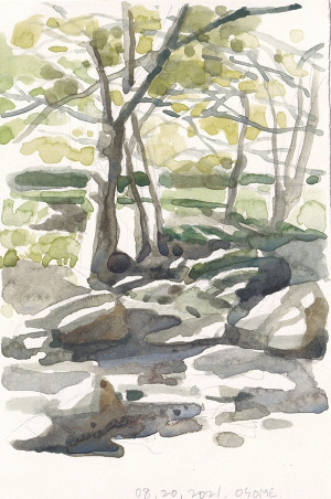 산등성이 위에 평화롭게 풀을 뜯는 소들 위로 큰 고래 한 마리가 지나가는 듯하다. 나도 그 고래 그림자 아래로 소들과 함께 7월의 뜨거운 태양을 피해 숨을 돌린다. 저 멀리서 떨렁거리는 소 방울 소리가 들린다. 망을 보던 소가 나를 보더니 멈칫한다. 고개를 앞으로 뒤로 휘저으며 경고를 주는듯하다. 얼른 저리 비키시지?라는 메시지 인듯하다. 아이고 미안 내가 너희들 자리를 빼앗었구나. 다 그리지 못한 그림을 가지고 덤벙덤벙 그들의 영역에서 벗어난다.