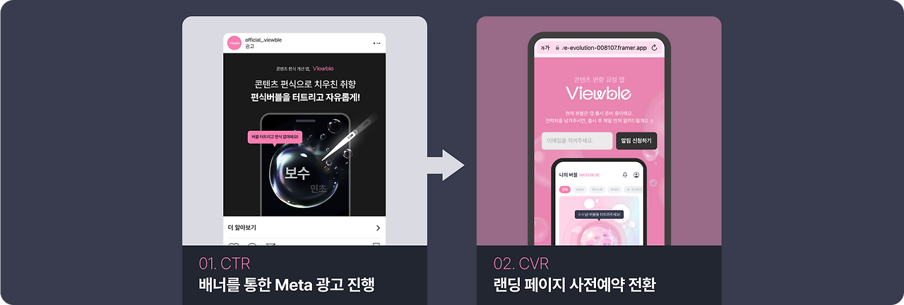 아이템별로 sns 광고 배너와 프리토타이핑 페이지를 제작하고, CTR(클릭률) / CVR(사전신청 전환율) 두 가지 지표를 수집했어요.