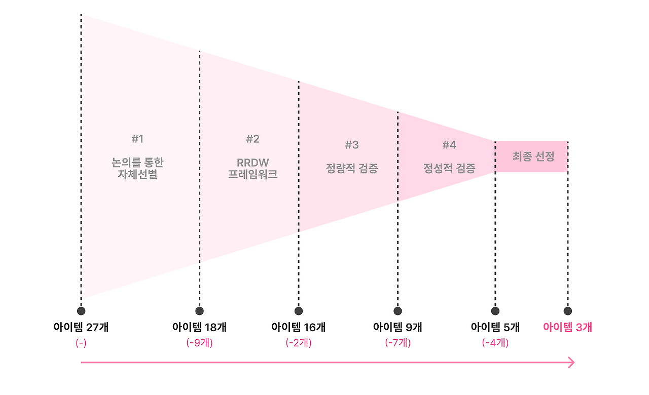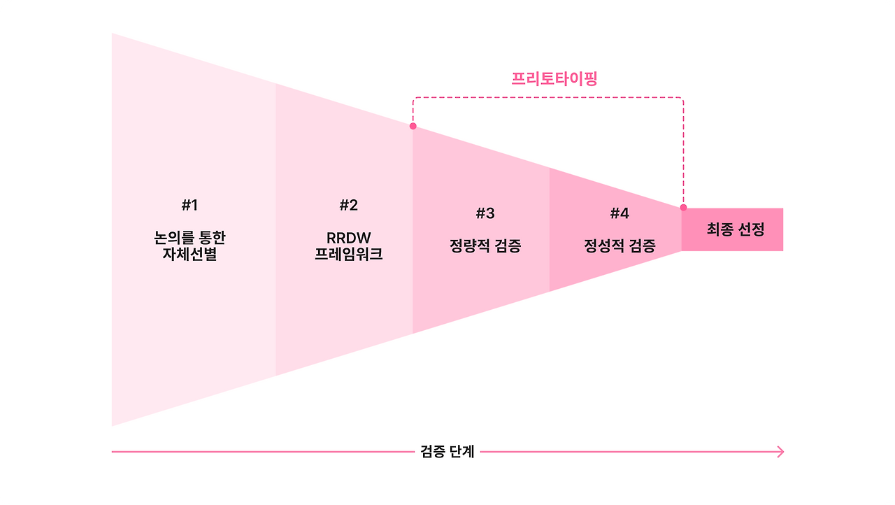 다음으로는, 리스트업 한 아이템의 유효성을 판단하기 위해 다음과 같은 단계를 구성해서 하나씩 검증하기 시작했습니다.
