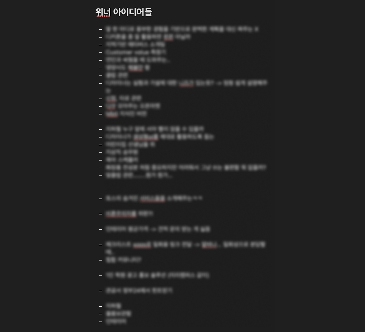 특히, 토스의 “유난한 도전” 책에서 나온, [고스트 프로토콜]에서 영감을 받아서 매주 1-2회씩 낯선 장소에 가서 팀원들과 함께 아이데이션을 통해 아이템을 리스트업 하고, 해당 리스트에 대해 리뷰하는 방식으로 진행했습니다.