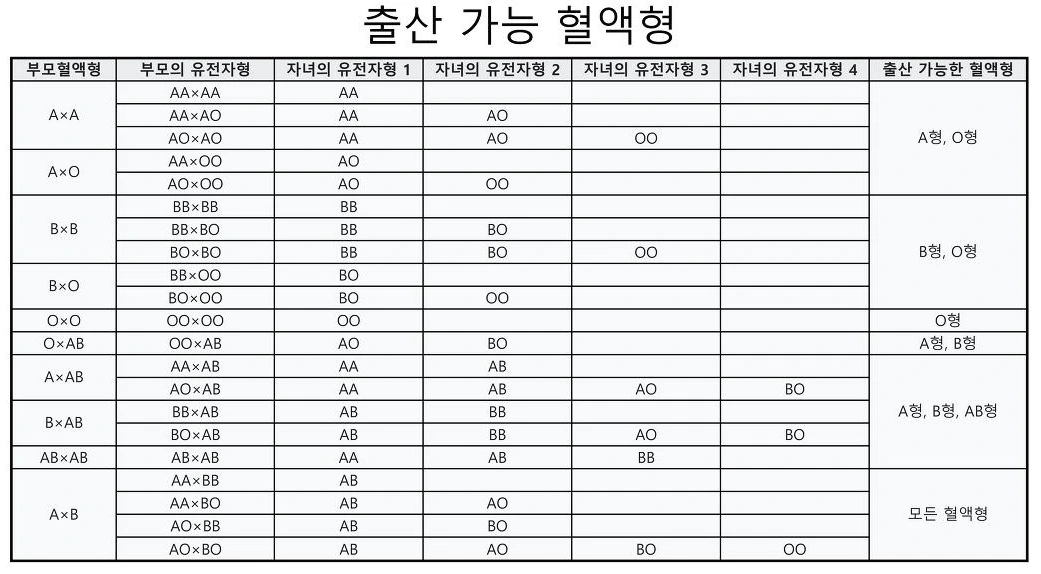 팩트 체크를 해보니 같은 A형이라도 AA형과 AO형으로 나뉘고 아버지(AO형)와 어머니(AO형) 사이에서는 OO형질을 가진 자녀가 태어날 수 있다는 거다. 이걸 확인하기 전까진 혈액형은 A, B, O, AB형만 존재하는 것으로 생각했다.