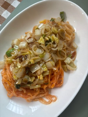 윤기도는 면 사이로 불향을 낸 양파와 알배추.