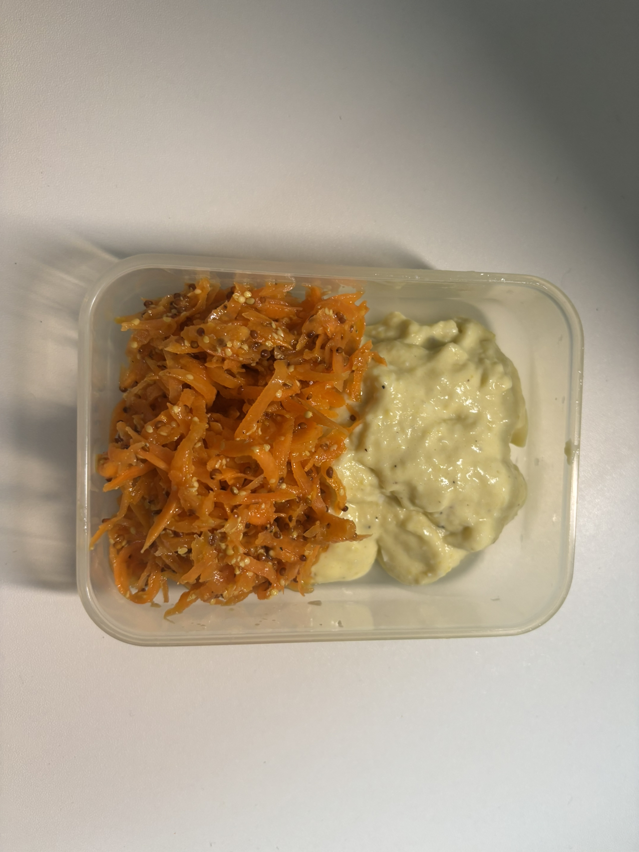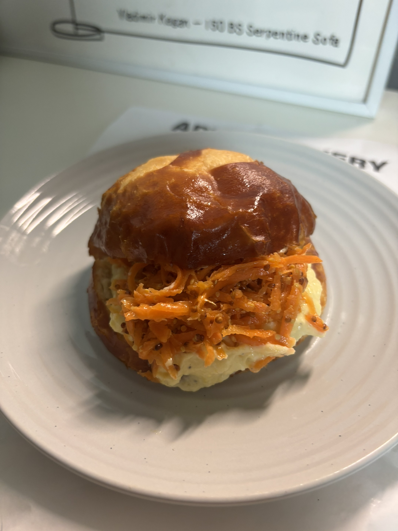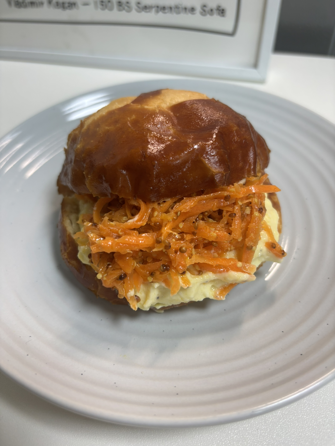 오븐에 살짝 구운 빵 사이로 만들어둔 당근라페와