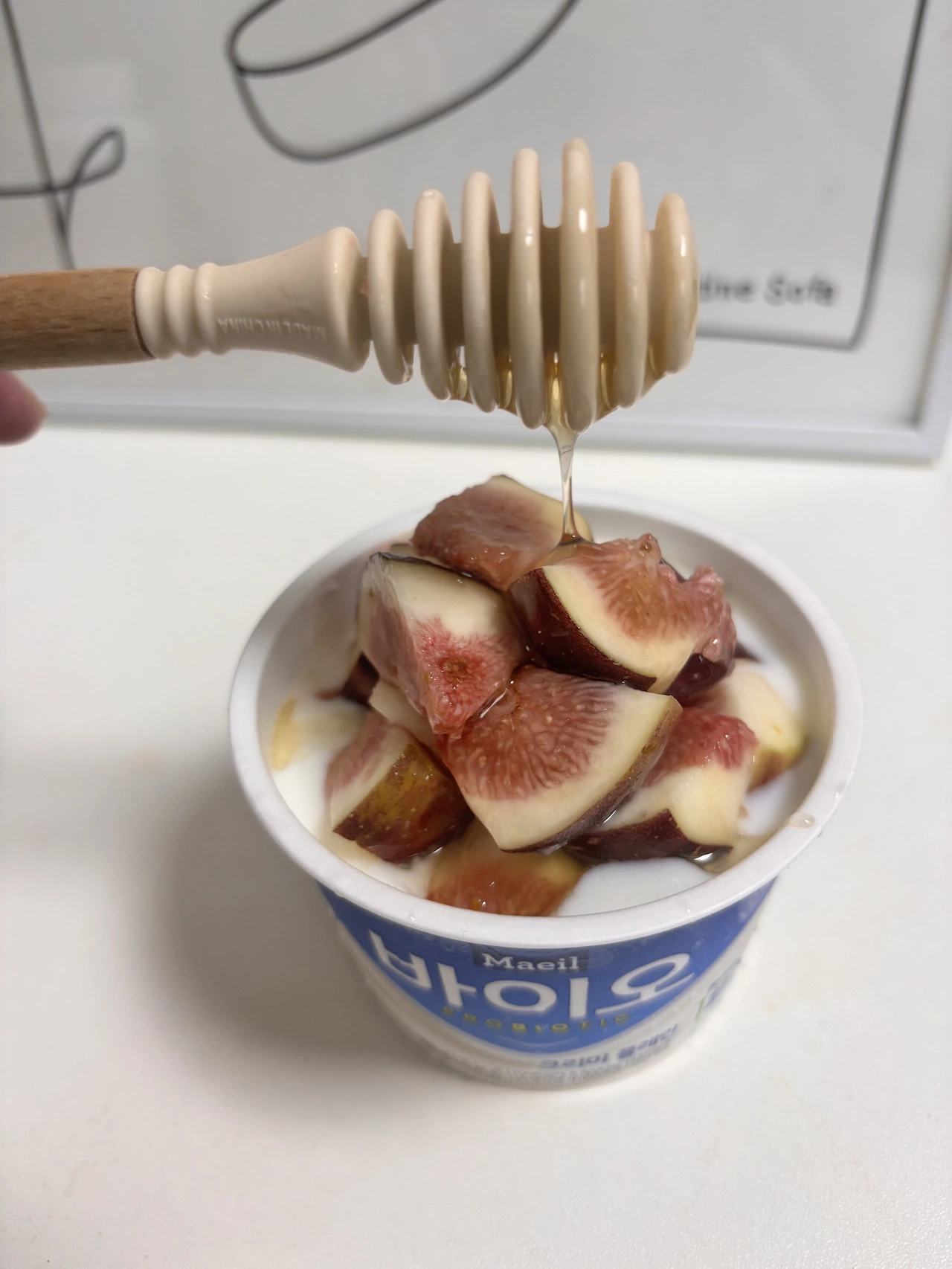 꿀 묻힌 무화과 한 조각을 요구르트에 푹 떠서 함께 입안으로 넣어준다.