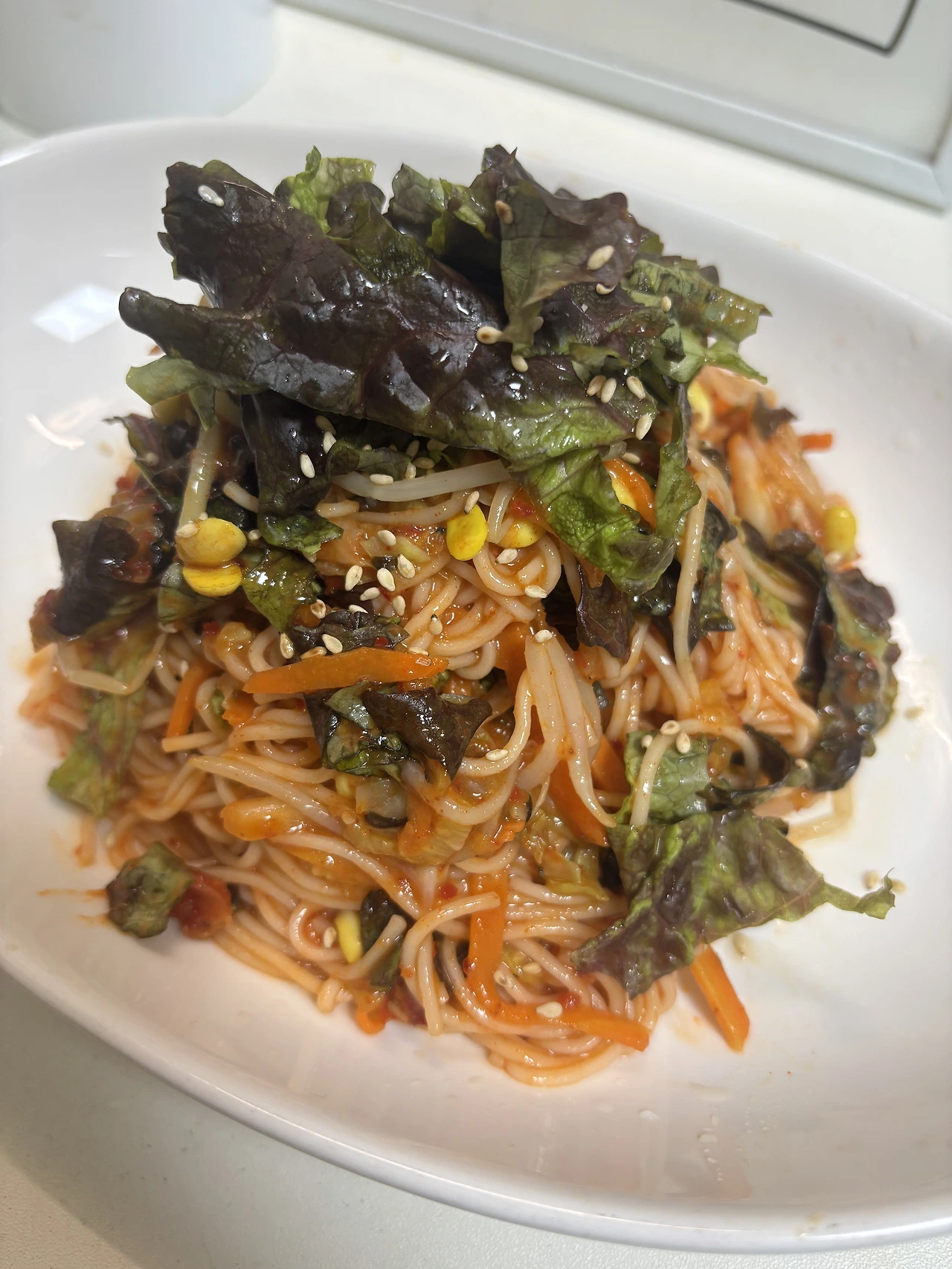 비빔국수를 입에 넣으면서 남아있는 김치를 다음엔 어떻게 먹을지 곰곰이 생각해 본다.