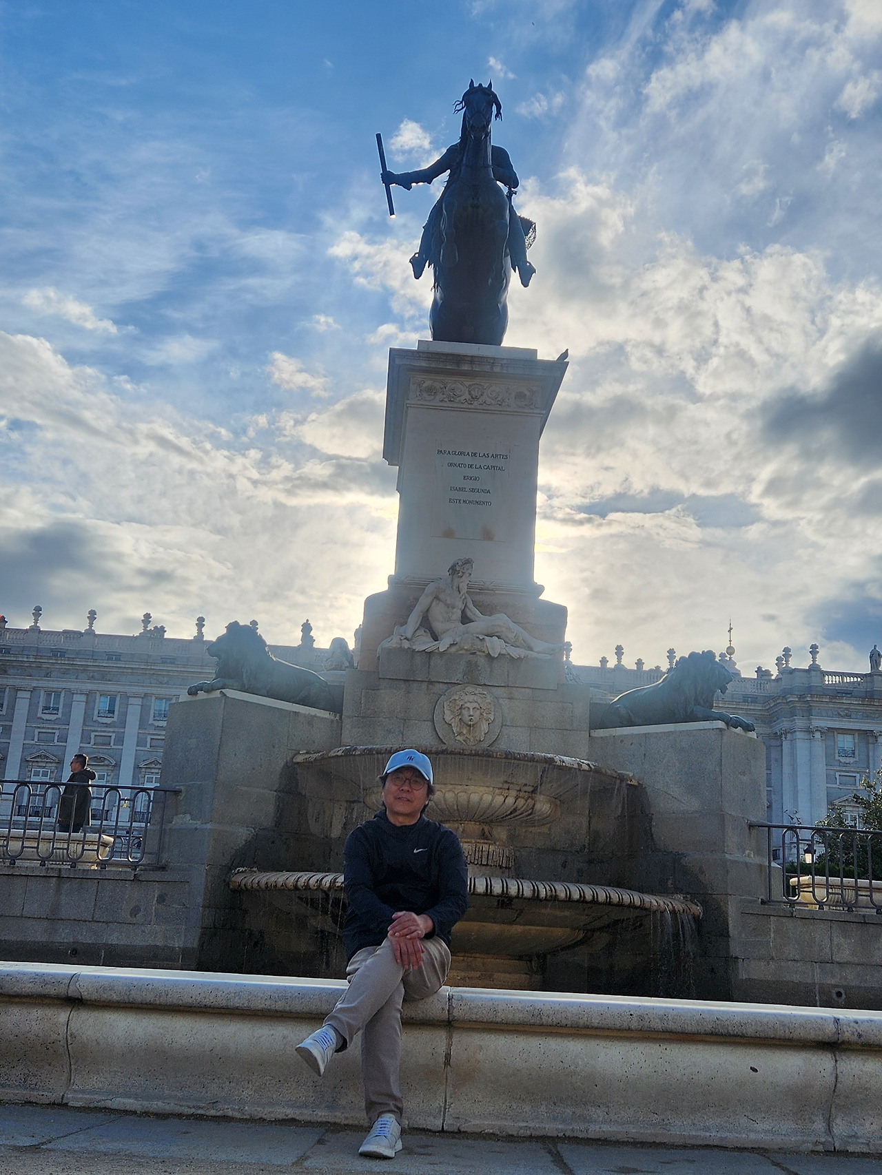 오리엔터 광장의 펠립4세 동상, 뒤는 마드리드 왕궁. 지친 표정이 역력하다.