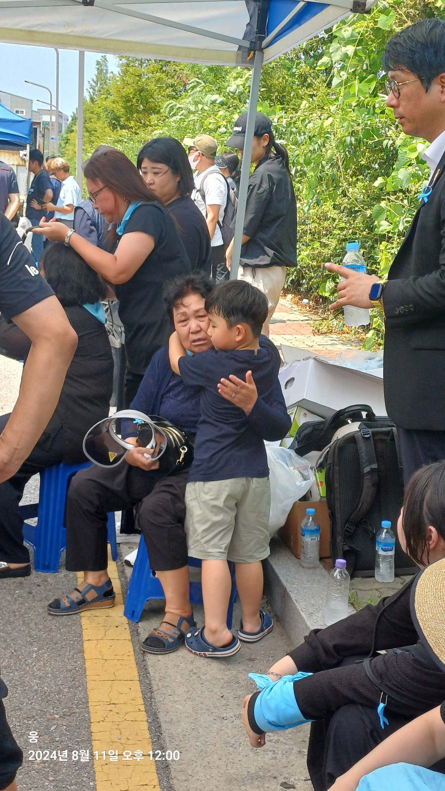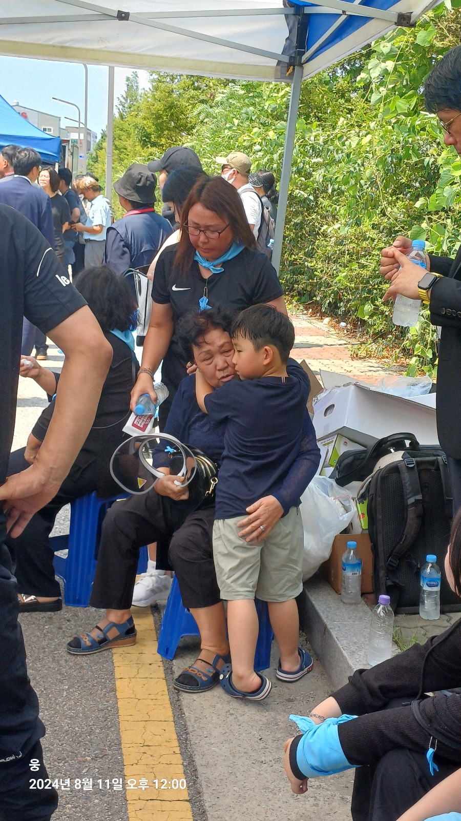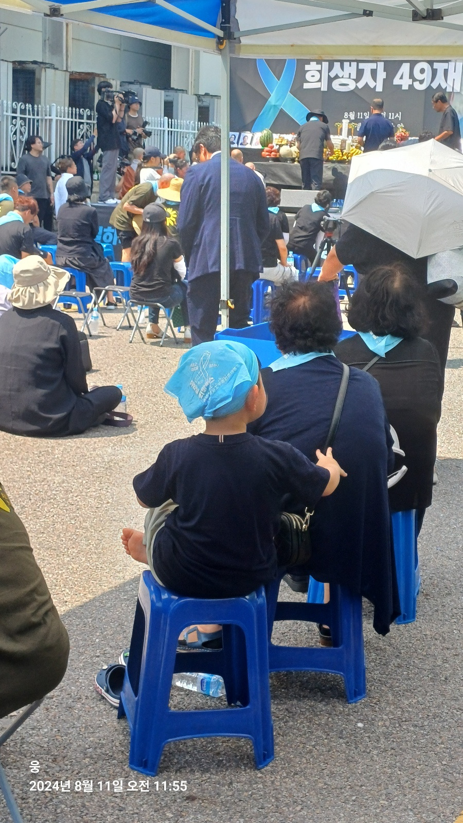 아리셀 공장 앞 아스팔트는 뜨거웠다. 34도가 넘는 온도와 아스팔트 열기에 슬금슬금 눈치를 보며 그늘로 자리를 옮겼다. 그곳에서 아이를 만났다. 아이는 할머니와 함께 있었다. 할머니의 보살핌에 아이는 의자에 가만히 앉아 있었다. 그 모습이 기특했는지 곁에 있던 할아버지가 아이에게 사탕을 입에 물려 줬다. 아이는 사탕을 입에 물고 인상을 썼다. 할아버지들이 좋아하는 계피 사탕 또는 박하 사탕이 아닐까? 안절부절 못하는 아이에게 할아버지는 손을 내밀었다. 할아버지 손에 사탕을 뱉은 아이는 이내 울상이 되었다. 곁에 있던 누나가 아이에게 물을 줬다. 아이는 물을 마시고 할아버지에게 주먹을 높이 들었다. 할아버지는 '아얏' 소리를 내며, 거짓 눈물을 흘렸다. 아이는 당황해하며 할아버지를 안아줬다. 할아버지는 주머니에서 사탕 하나를 아이에게 또 건넸다. 아이는 사탕을 쳐다보지도 않고, 냉큼 자기 자리로 돌아갔다. 참울한 49재 분위기에 짧게나마 웃음이 새어나온 장면이었다.