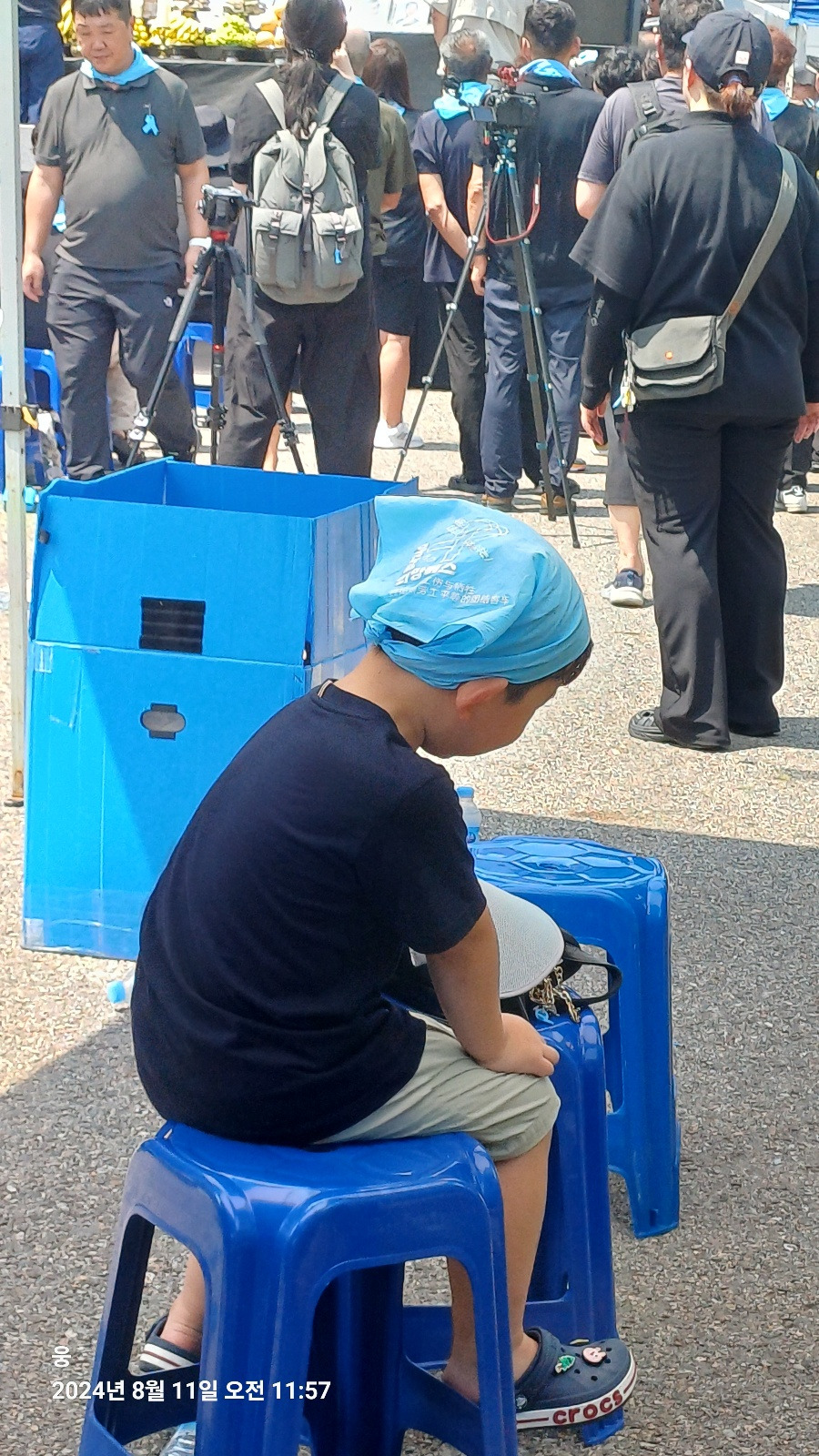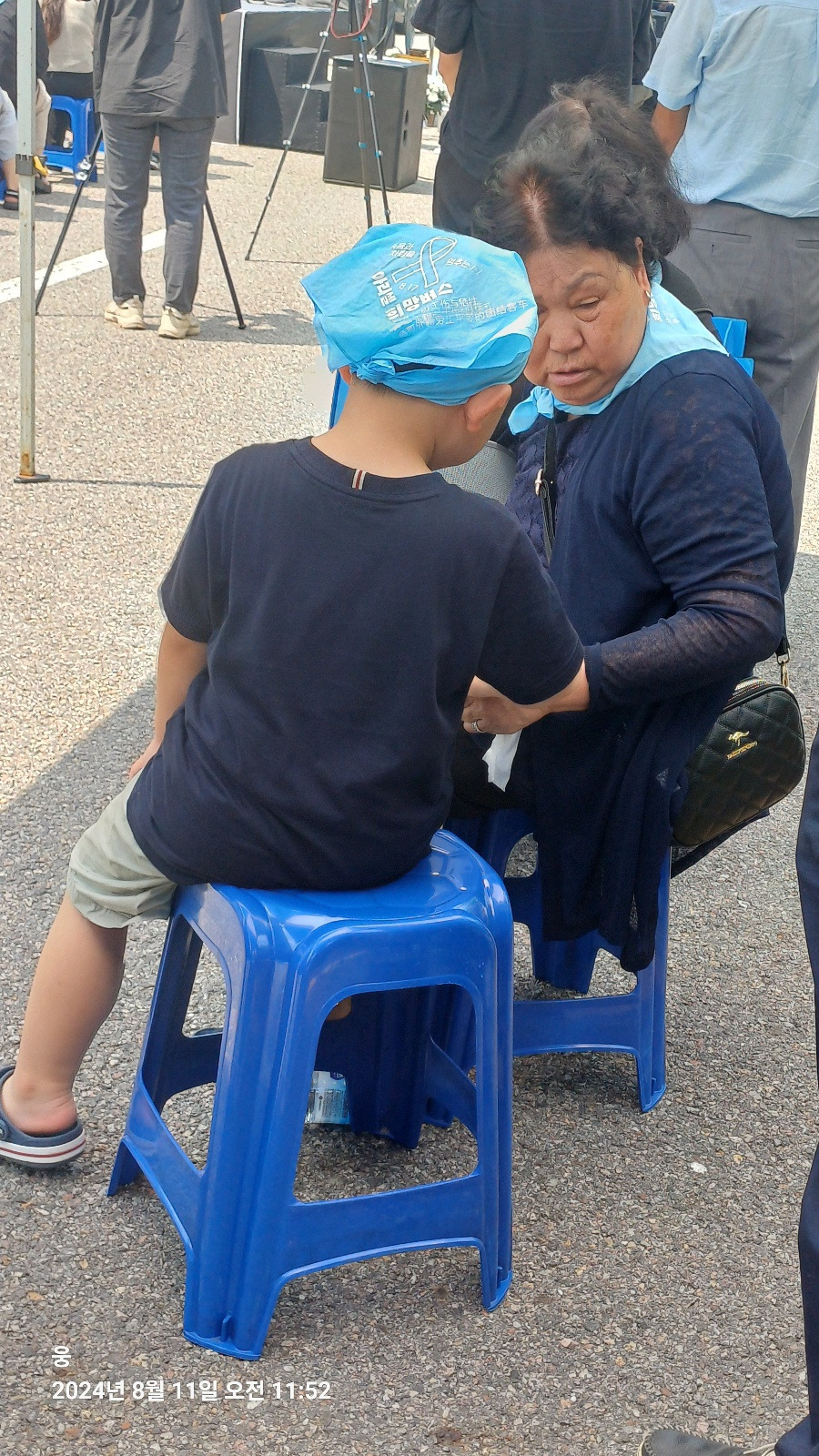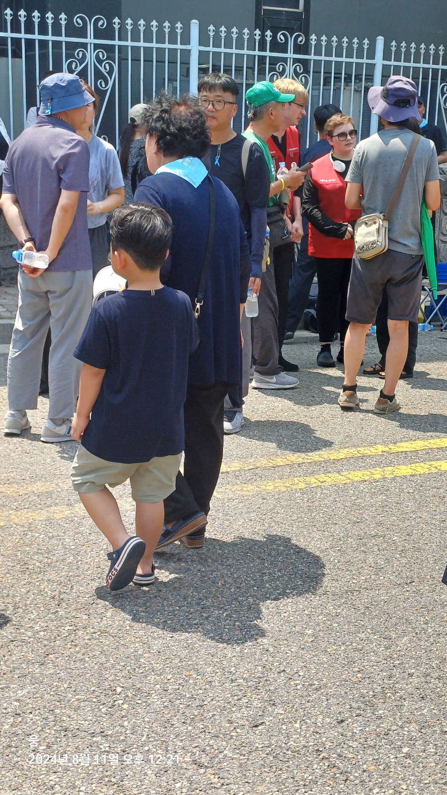 아리셀 공장 앞 아스팔트는 뜨거웠다. 34도가 넘는 온도와 아스팔트 열기에 슬금슬금 눈치를 보며 그늘로 자리를 옮겼다. 그곳에서 아이를 만났다. 아이는 할머니와 함께 있었다. 할머니의 보살핌에 아이는 의자에 가만히 앉아 있었다. 그 모습이 기특했는지 곁에 있던 할아버지가 아이에게 사탕을 입에 물려 줬다. 아이는 사탕을 입에 물고 인상을 썼다. 할아버지들이 좋아하는 계피 사탕 또는 박하 사탕이 아닐까? 안절부절 못하는 아이에게 할아버지는 손을 내밀었다. 할아버지 손에 사탕을 뱉은 아이는 이내 울상이 되었다. 곁에 있던 누나가 아이에게 물을 줬다. 아이는 물을 마시고 할아버지에게 주먹을 높이 들었다. 할아버지는 '아얏' 소리를 내며, 거짓 눈물을 흘렸다. 아이는 당황해하며 할아버지를 안아줬다. 할아버지는 주머니에서 사탕 하나를 아이에게 또 건넸다. 아이는 사탕을 쳐다보지도 않고, 냉큼 자기 자리로 돌아갔다. 참울한 49재 분위기에 짧게나마 웃음이 새어나온 장면이었다.