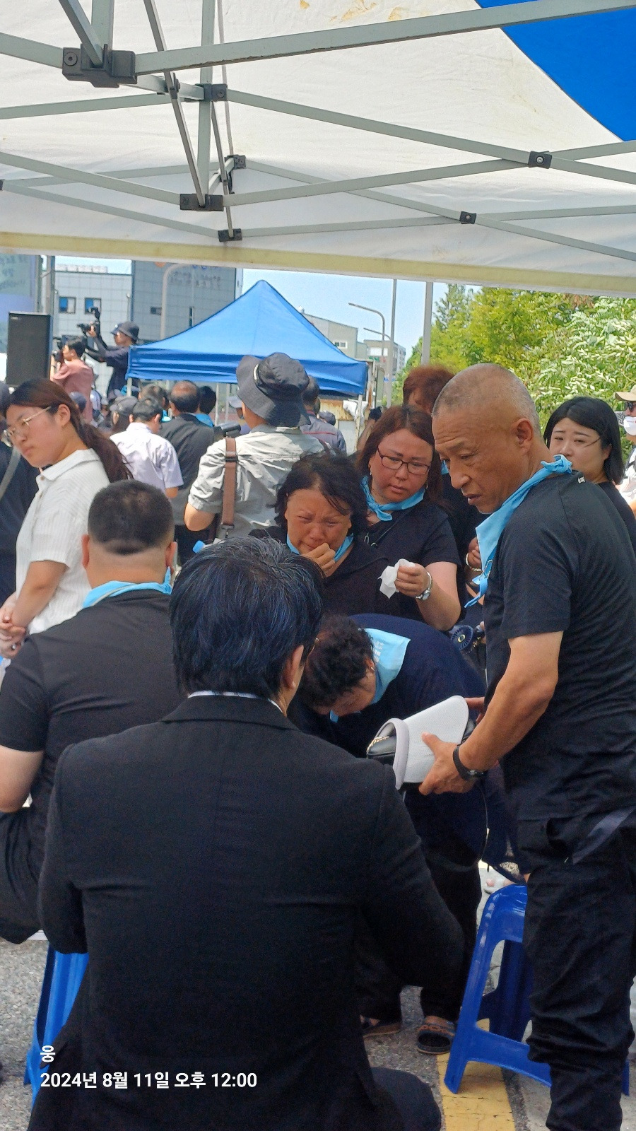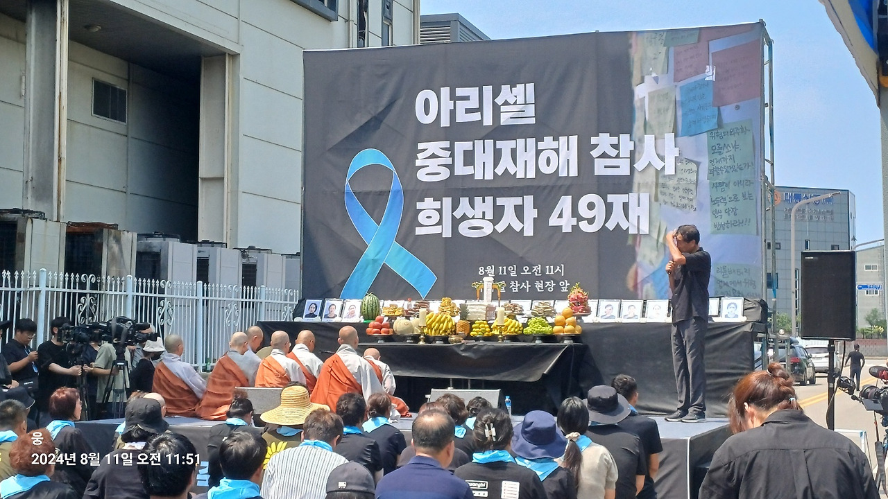 8월11일은 아리셀 중대재해 참사 희생자 49재였다. 참사가 일어난 시각인 11시에 49재는 시작되었다.