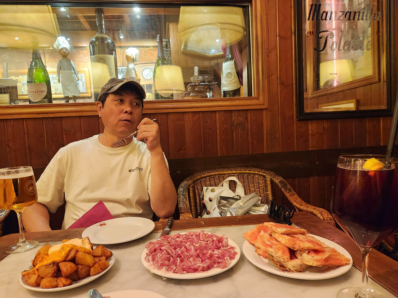 어쨌든 영화 세트장 같은 멋진 자리에서 하몽과 빠따따스 브라바스, 바삭바삭한 빵 위에 토마토를 얹은 판콘토마테를 맛있게 즐겼다. 특히 하몽! 와, 입에서 살살 녹는 게, 이게 하몽의 진짜 맛이구나! 그동안 왜 하몽, 하몽 하는지 몰랐는데 오늘 드디어 깨달았다. 여행 끝나기 직전에 담백하고, 고소한 하몽맛을 발견하다니 억울하지만, 어쨌든 럭키 비키!