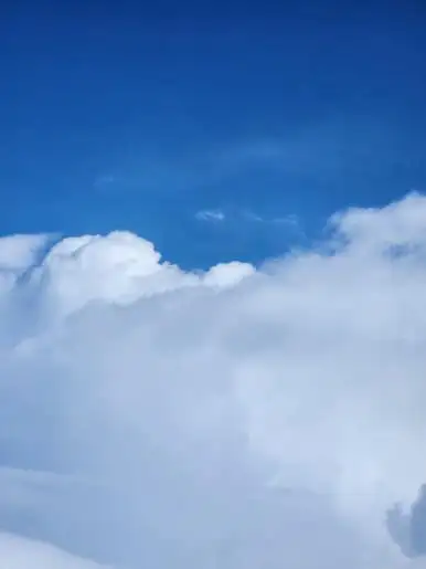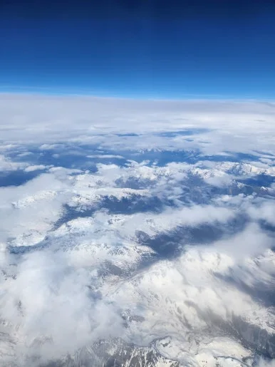 출발하기 직전엔 날씨가 흐렸는데 구름 위로 올라가니까 맑아진 하늘, 정말 크레파스 하늘색이었다