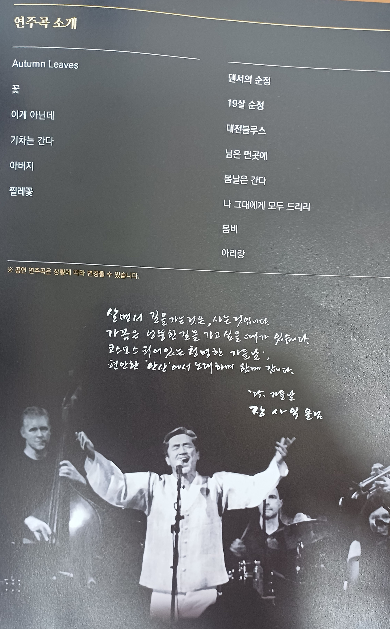 시작 종이 울리고 토론토 재즈 오케스트라가 자리에 앉는다. 뒤이어 지휘자가 나와 'Autumn Leaves'를 시작으로 막이 올랐다. 두루마기를 곱게 차려입은 장사익 님이 등장한다. 나도 모르게 긴장한다. 성대결절로 수술을 받았는데 괜찮을까? 예전처럼 소리가 나올까?