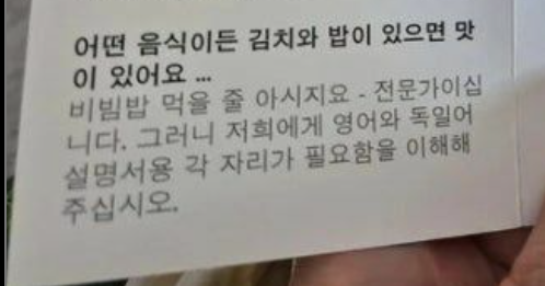 비빔밥과 맥주와 위스키. 비빔밥을 독일어와 영어 그리고 한글로 설명했다. 독일어와 영어는 무슨 말인지 모르겠다. 하지만 한글은 명확했다.