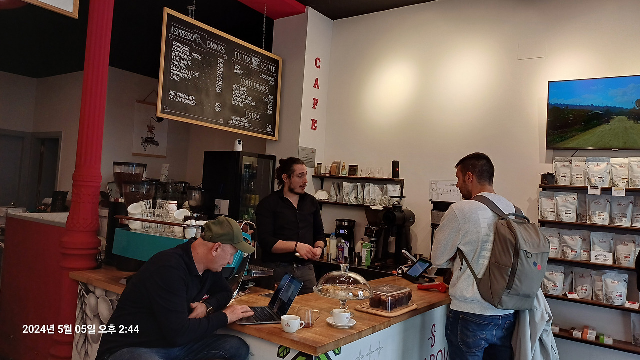“커피 한 잔 마시고, 솔광장과 마요르 광장으로 이동하겠습니다. 이곳 DABOV 스페셜 커피 전문점은 한국인들 사이에 커피가 맛있다는 평이 많습니다. 아시겠지만 스페인에는 아이스 아메리카노는 없습니다. 그럼, 아버님은 아메리카노?”
