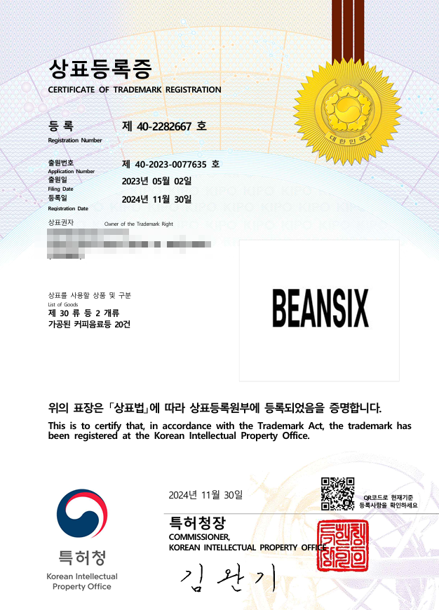 ‘빈식스(BEANSIX)’의 법적인 생일은 2024년 11월 30일이다. 대한민국 특허청에서 이날 상표가 등록되었다. 이 상표권은 상업적으로 독점사용을 위해 특허청에 심사를 받아 등록하는 권리인데, 사람으로 따지면 호적에 이름을 올린 것과 같은 것이다. 다만, 사람은 동명이인이 어느 동네에서 동시에 사용해도 무관하지만, 상표권은 출원한 상표분류군에서는 절대 사용이 불가한 독점적 권리다.