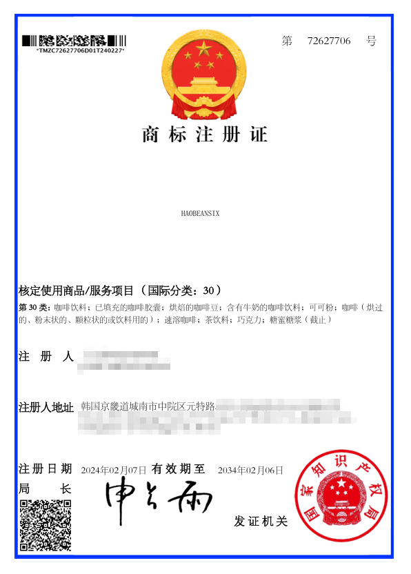 그런데, 중국에 등록된 상표는 빈식스(BEANSIX)가 아닌, 하오빈식스(HAOBEANSIX)다.