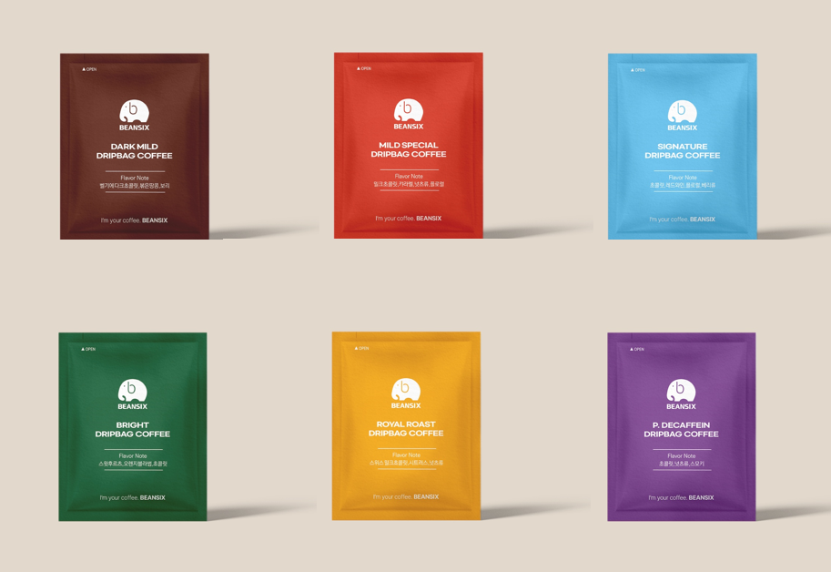 빈식스드립백 커피는 6종을 출시한다. 커피의 산미와 특징에 따라 구분되어 붙여진 각각의 세부 명칭도 드립백 봉투 색상과 나름 잘 어울린다. 참고로 이 패키지 디자인과 색상이 결정될 때까지 수십 번 이상의 수정을 거치는 개발과정이 있었는데, 그건 아내에게 최종 승인을 받지 못해서다.