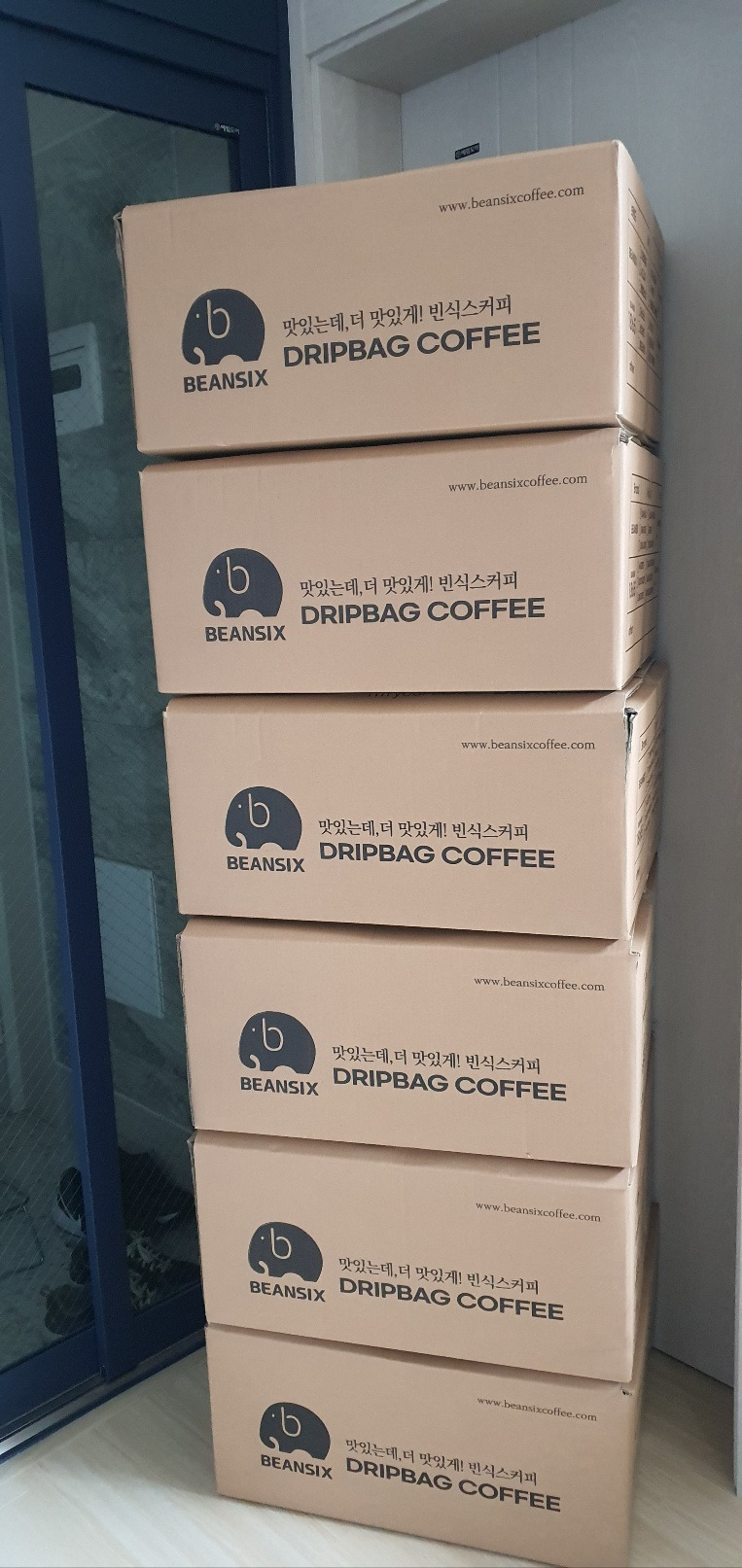 이 박스 안에는 이제 곧 회사에서 유통할 드립백커피가 들어 있다. 박스가 6층 탑을 이룬 것은 드립백커피 6종을 모두 내가 집으로 가지고 왔기 때문이다. 그냥 확인용 샘플만 몇 개 가지고 오면 되었는데, 이왕 협력사를 방문한 김에 택배비도 절감하고, 가족과 지인들 선물로 나누어 주고 싶은 마음의 충동을 이기지 못해서 만든 결과물이다. 아무튼 며칠 내 선물로 사라질 커피들이지만 집안 가득 쌓여 있는 커피를 보니 기분은 마냥 좋다.