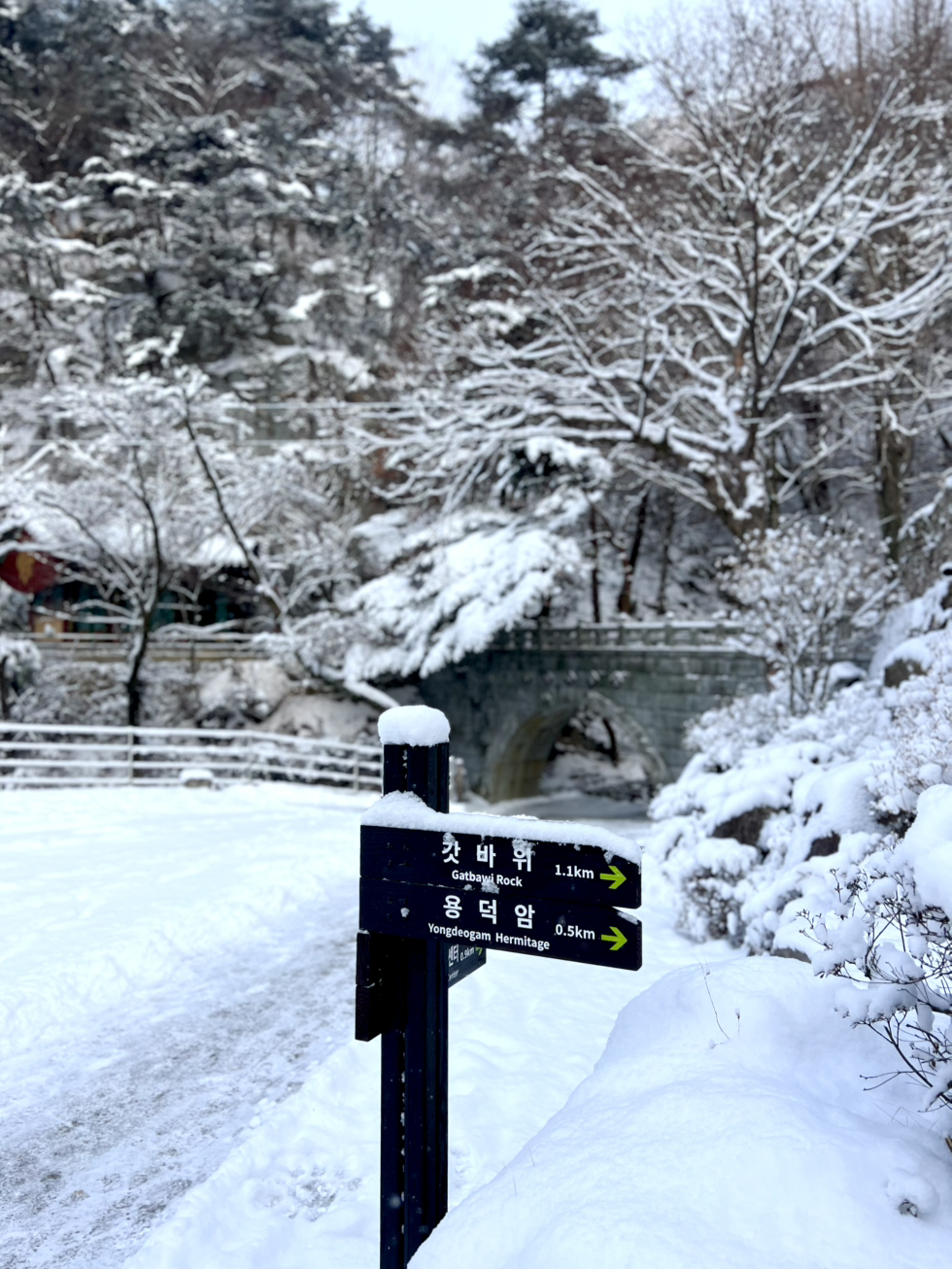 따뜻한 남쪽 나라에 사는 이에겐 눈이 아주 특별하다. 특별하기에 늘 누군가와 함께 눈 내림의 설렘을 맛보러 내가 사는 일상에서 벗어나곤 했었다. 이번 명절은 눈 소식이 있다고 했다. 그것도 많은 눈이 예상된다며 명절을 보내러 출발하기도 전에 핸드폰에선 재난 문자가 미리 알려준다. ”눈길 운전 조심“ 시댁으로 출발하기 전 어머님께 온 영상통화에서도 온통 하얀 눈 세상이 보인다. ”더 조심히 올라갈게요. “ 명절을 보내러 가는 며느리 마음과 달리 마치 여행길에 오르는 것처럼 설렌다. 시부모님이 계신 팔공산에 이렇게 눈이 많이 내린 걸 보러 가는 것도 결혼 13년 차, 명절 덕분에 처음 있는 일이다. 눈길 운전에 대한 걱정과 달리 올라가는 고속도로는 해가 쨍쨍이다. 내렸던 눈도 다 녹을 정도로 따스한 햇살이다. 그 따스함 속에 저 멀리 소복이 가득 쌓인 설산을 보며 설렌다. 곧 가까이에서 만나게 될 팔공산에 대한 기대감으로. 겨울 산을 혼자 오르고 있을 나를 상상하며.