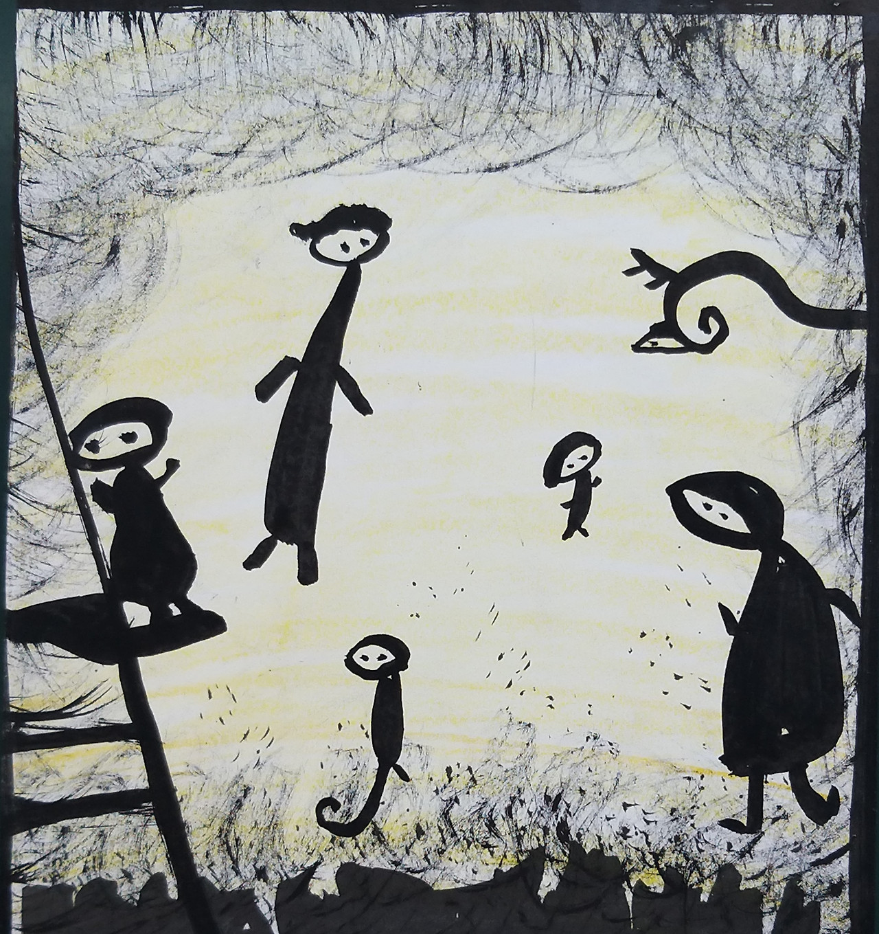 한달이 시간이 지나고 두 번째 연수 날이 되었다. 나는 약간의 설렘과 좋아하는 나무 언니를 만난다는 것에 신이 났다. 함께 연수에 참여하며 장소를 제공하기로 했던 선생님이 갑자기 아파서 예정된 장소에서 작업이 어려워졌다. 갑자기 숲이 있는 조용한 모델을 장소로 정하고가 골방에 틀어박혀 심오한 작업을 하듯 그렇게 집중하며 작업을 하게 되었다. 나는 검은색이 계속 칠해진다고 하며 작업을 했다. 나무 언니는 괜찮다고 하고 싶은 대로 하라고 했다. 다음 만다라 작업에서 검은색 그림자 같은 2개의 형체가 그림으로 나왔다. 시간이 늦어서 잠을 자고 다음날 작업을 이어가기로 했다.