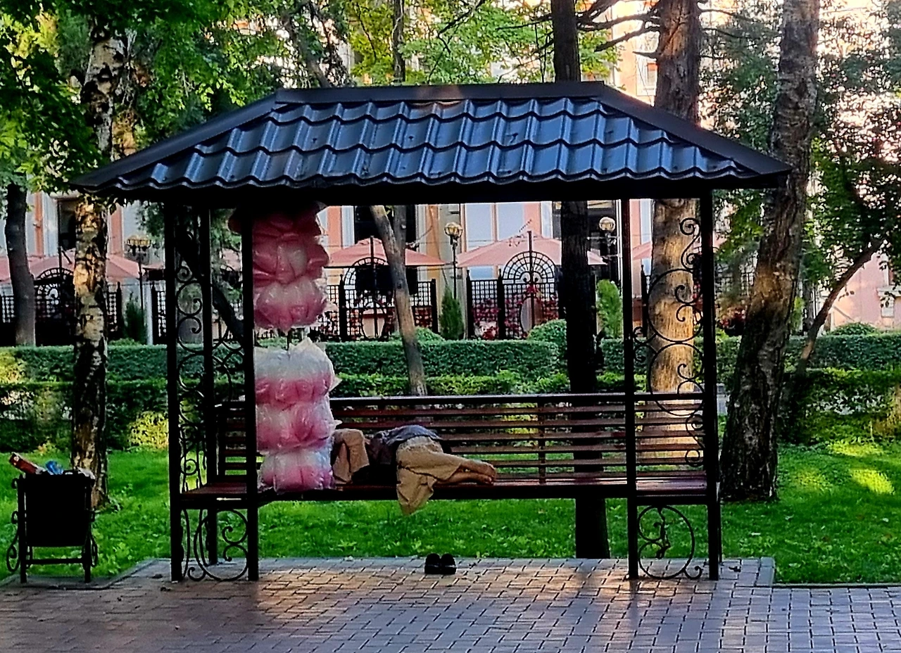 월요일 아침. 자유란 이름을 가진 가로공원 에르킨딕으로 운동하러 나섰다. 멀리 보이는 지붕있는 벤치에 여러 색깔의 풍선들이 가득하다. 그런데 가까이 가보니 비닐에 싸인 솜사탕이다. 그리고 그 아래 벤치에 웬 여인이 웅크린 채 잠들어있다. 못다 판 솜사탕을 어쩌지 못하고 그냥 그 벤치에서 잠들어버린 젊은 아가씨다.