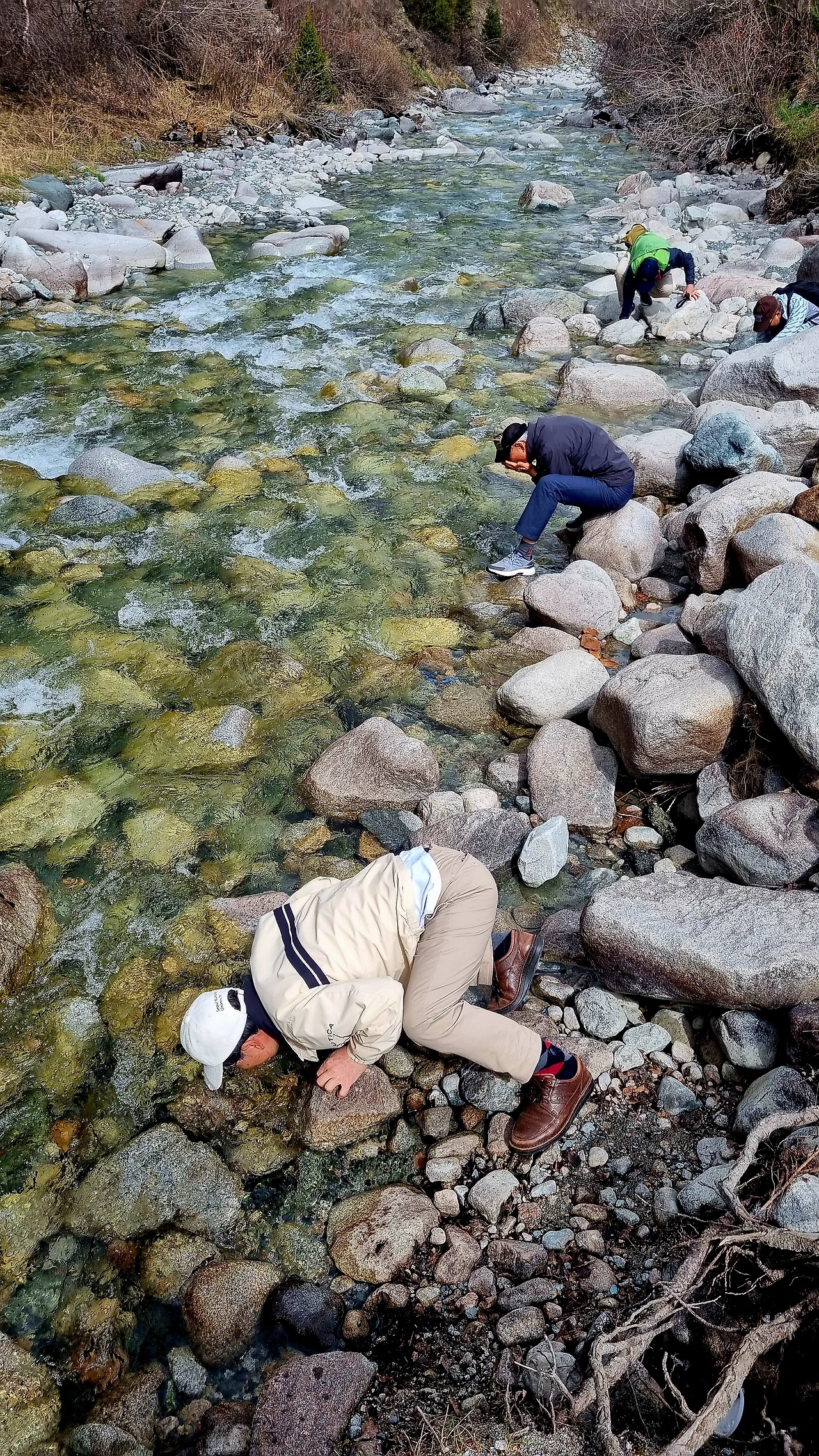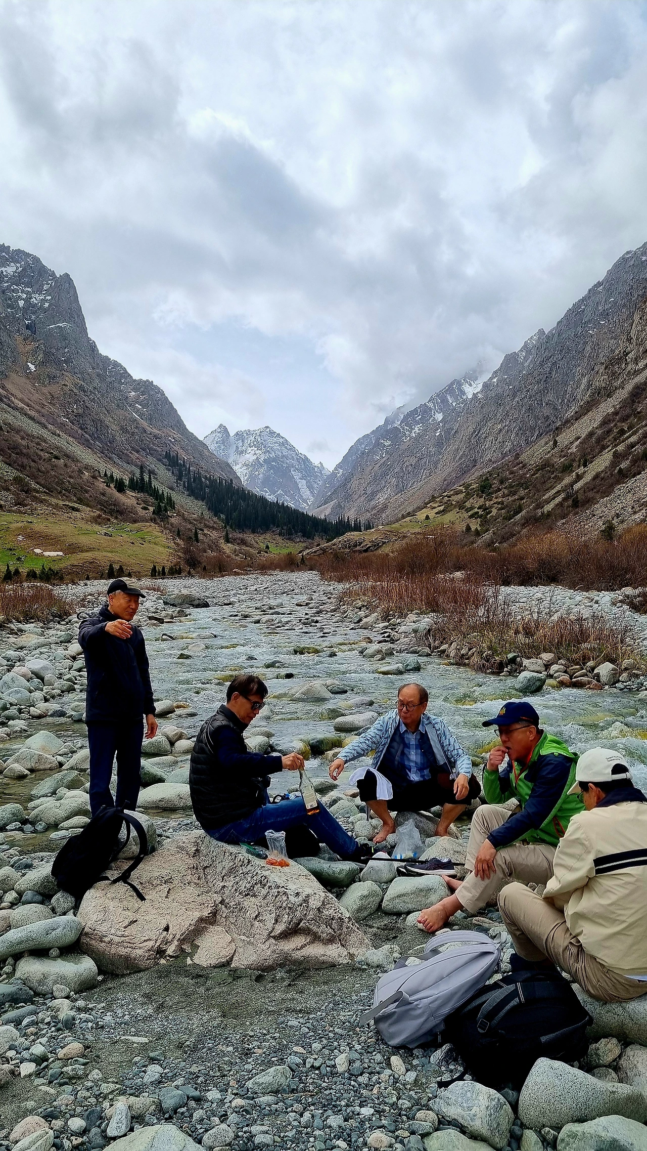 오늘은 인근의 국립공원인 Ala Archa산으로 가는 날이다. Yandex 앱으로 미니밴을 불렀다. 나타난 차는 그냥 4명이 타면 될 법한 오래된 중고차였다. 운전기사가 씩씩하게 뒷문을 열고 뒷좌석 2개를 펼쳐주며 앉으란다. 불편하지만 1대로 가는 것이 나을 것 같기에 낑겨서 탔다. 뒷좌석에 탄 친구 둘이 고생스러웠으리라... 30분쯤 달려서 국립공원 입구에 도착하였다. 비가 와서 안개 속을 거닐다 오면 어쩌나 하고 걱정했었는데 다행히 날이 갰다. 우뚝 솟은 봉우리들에 친구들이 경탄의 함성을 지른다. 시작점은 해발 2,200m다. 잘 정비된 완만한 오르막길을 따라 산보처럼 걷다가 계곡물이 흐르는 곳에 이르자 여우들이 일제히 개울가로 달려가서 고개를 박고 물을 마신디. 수많은 세월이 지났건만 본질은 모두 촌놈들이다. 그래 그렇게 염원해 왔던 천산산맥의 눈녹은 물, 천산수(天山水)다. 싫컷 마시고 오래오래 건강하게 살거라...