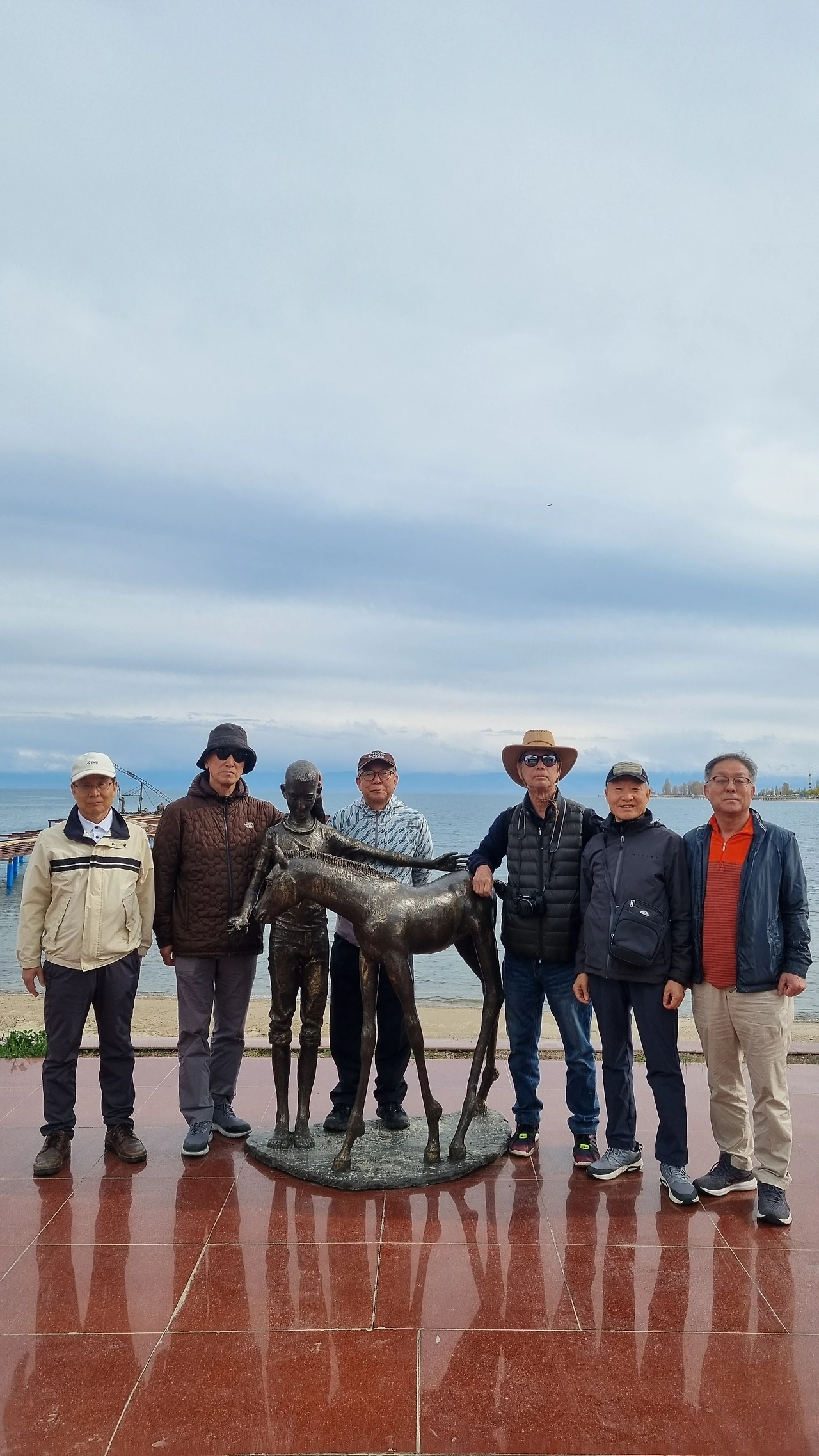 설산으로 둘러쌓인 신비한 호수다 보니 여러 가지 전설도 많이 떠돌고 있다. 호수 속에 도시 몇 개가 잠겨 있다고도 하고, 수백 킬로 떨어진 카자흐스탄의 Balkhash 호수에서 침몰된 배의 잔해가 이시쿨 호수에서 발견되었다던지, 심지어는 징기스칸의 무덤이 이 호숫가 어딘가에 있다는 이야기까지 회자되고 있다. Fortuna호는 촐폰아타항이 아득히 보이는 호심까지 나아갔다. 호수 건너편 남쪽 풍광이 조금 가까워졌지만 구름이 워낙 짙게 드리워 설산이 확연히 드러나지 않는다. 단지 석양 햇살이 비추는 쪽에 구름이 살짝 걷힌 공간으로 멀리 설산의 웅자를 엿볼 수 있을 뿐이다. 반면 북쪽과 북동쪽 사면의 설산은 하얀 능선이 명료하게 드러나 있다. 미녀의 옷자락 위로 노출된 하얀 어깨처럼 설산의 능선이 드러났다가 사라지곤 한다. 늙은 오빠들은 배를 탄 것만으로도 마냥 즐겁다. 연신 카메라를 사방으로 돌리며 감격에 젖는다. Santa Lucia 노래를 선창하고 싶으나 목이 잠겨서 침묵의 미소로 바라볼 뿐 노래부를 엄두도 못내서 아쉬웠다. 열심히 친구들 얼굴을 카메라에 담았다. 배는 큰 원을 그리며 출발지로 회귀하기 시작한다. 저녁 무렵이 되면서 날씨도 차갑다. 입항할 때까지 선실에 들어가서 창 넘어로 이시쿨호수의 풍광을 만끽했다. 1시간에 6,000솜(9만원)에 배 전체를 빌렸으니 싸게 이용한 셈이다.