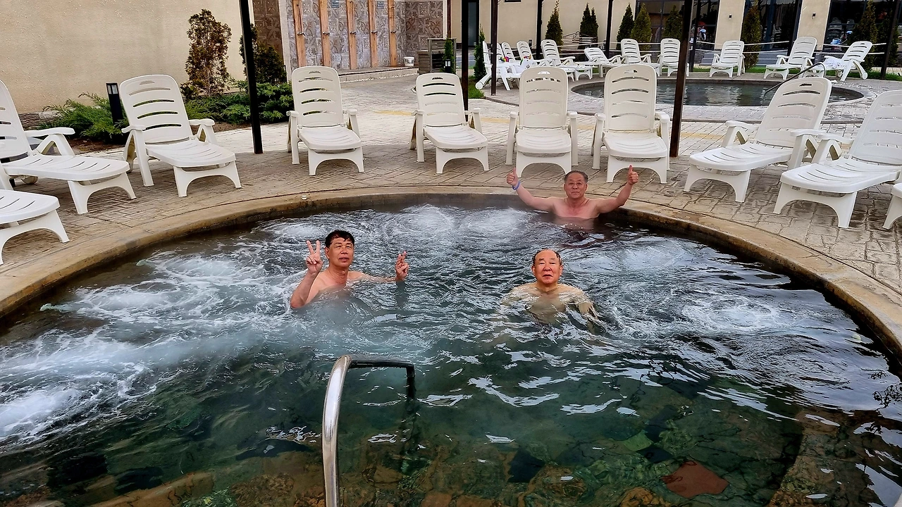 암각화공원은 내일 오전에 들르기로 하고 3km 떨어진 Dolinka란 마을에 있는 온천장 숙소인 Ak Bermet(백진주) Resort로 갔다. 역시 3월말 답사여행 때 와 본 곳이라서 내겐 낯설지 않다. 둘이서 방 1씩 배정 받고 온천욕을 하기로 했으나 신도철과 함께 쓰기로 한 404호실 방이 열리지 않아서 이리저리 오가며 해결하느라 거의 30분을 허비했다. 정말 서비스 정신은 바닥인 호텔이다. 소비에트 시절에 공산당원들의 휴양소 내지는 요양원(sanatorium)으로 활용되던 시절을 불하 받아서 운영하는 호텔이니 영어도 안 통하고, 신용카드도 안받아서 뭉치돈을 준비해 와야 하는 이상한 리조트다. 그러나 야외온천장은 키르기스스탄에서 가장 근대화된 시설로 알려져 있다. 각각 다른 온도의 노천탕이 6개가 있다. 드디어 준비가 되어 일행들과 온천을 즐겼다. 지붕 너머로 설산을 바라보며 즐기는 온천욕이 상당히 이색적이다. 비교적 간단히 온천을 한 후 식당에서 저녁 식사를 했다. 손님은 많은데 홀 서빙하는 직원은 젊은 여성 딱 1명이다. 주문 받으랴, 계산기에 입력하랴, 수저-접시-물잔 갖다 주랴, 음식 날라 오랴, 계산하랴 정신이 하나도 없이 바쁘게 불려 다닌다. 미안해서 주문할 염치도 없는데 나는 목도 아프고, 피곤해서 정신이 몽롱하고, 어떻게 시켜야 되는지도 모른 채 이것, 저것 시키다 보니 음식이 드문드문 나온다. 뭘 먹었는지 기억도 없이 긴 저녁식사 시간이었다. 옆 테이블에는 건장한 청년들 20여명이 자기들이 들고 온 고기를 잔뜩 쌓아놓고 신나게 뜯고 있다. 늑대 다음으로 고기를 많이 먹는다는 유목민 키르기즈인들의 엄청난 고기 소비를 보여주는 광경이었다.